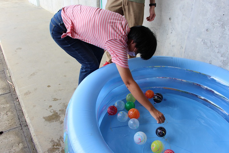 昨今新型コロナウイルス感染拡大の影響で行事等が中止となる中、余暇支援も感染対策を徹底しながら、今回も開催日を分け、人数を縮小しての開催となりました。今回の余暇活動は、たまん施設にて夏まつり風に『風船ヨーヨー釣り』や『金魚すくい』、『射的』、『ミニボウリング』などいくつかゲームを用意しました。皆さん、各ブースを周ってゲームに参加していました。ゲームに成功して景品のお菓子をゲットしたり、風船ヨーヨーを見事釣りあげて嬉しそうにしたりと皆さんとても喜んでいました。また、昼食後のおやつには夏の風物詩としての『かき氷ぜんざい』を用意しました!!皆さん「冷た~い」「おいしい!」と大好評でした。今年の夏も皆さんお仕事お疲れ様でした!今後も余暇活動を楽しみながらお仕事も頑張りましょう。