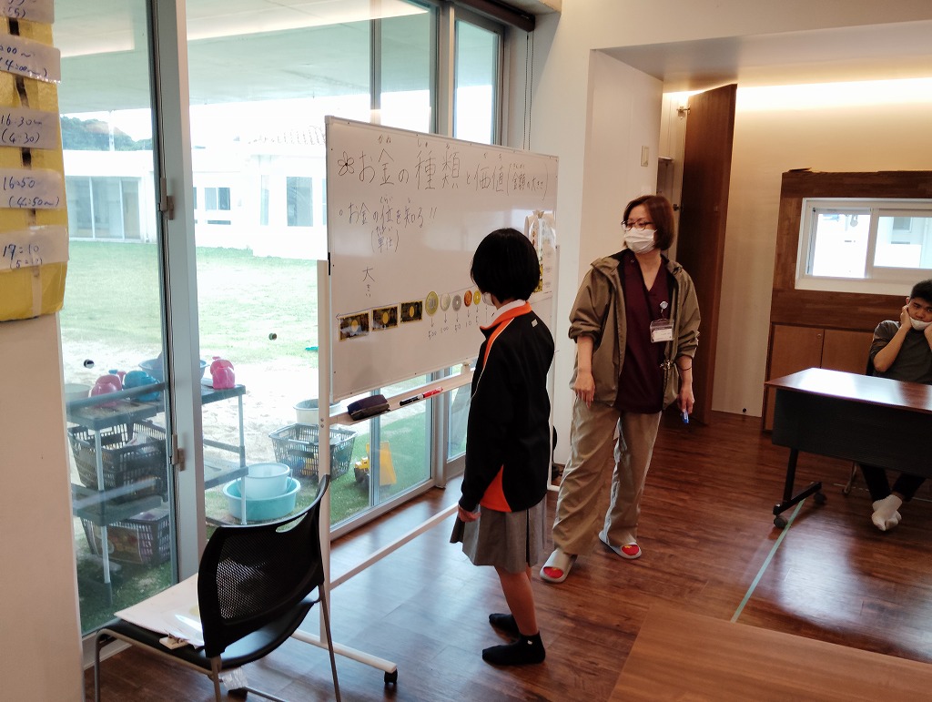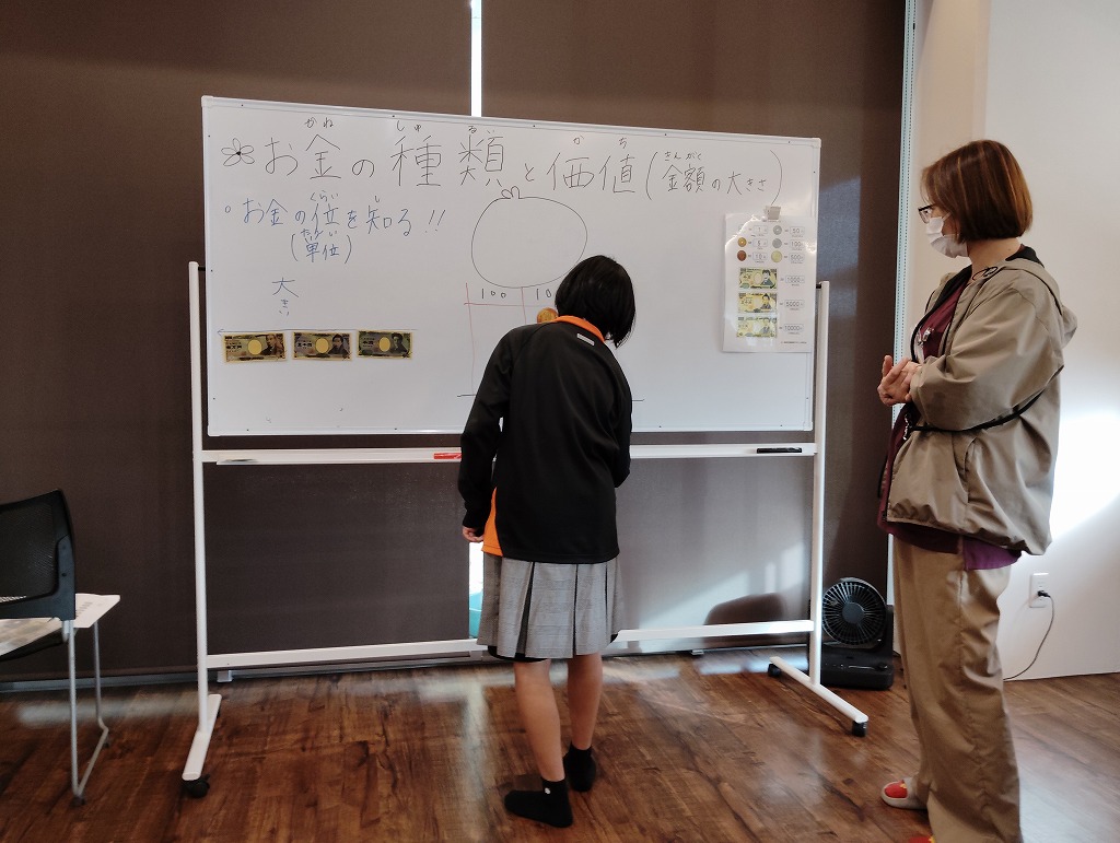 みんなの前で発表する形式であったので、座学では問題なくできるけど、緊張してしまい自信がなくなってしまう児童もいましたが、お金の大きさを順番に並べるといった簡単な問題からひとつずつ確認することで、参加した児童みんなができるようになっていました。