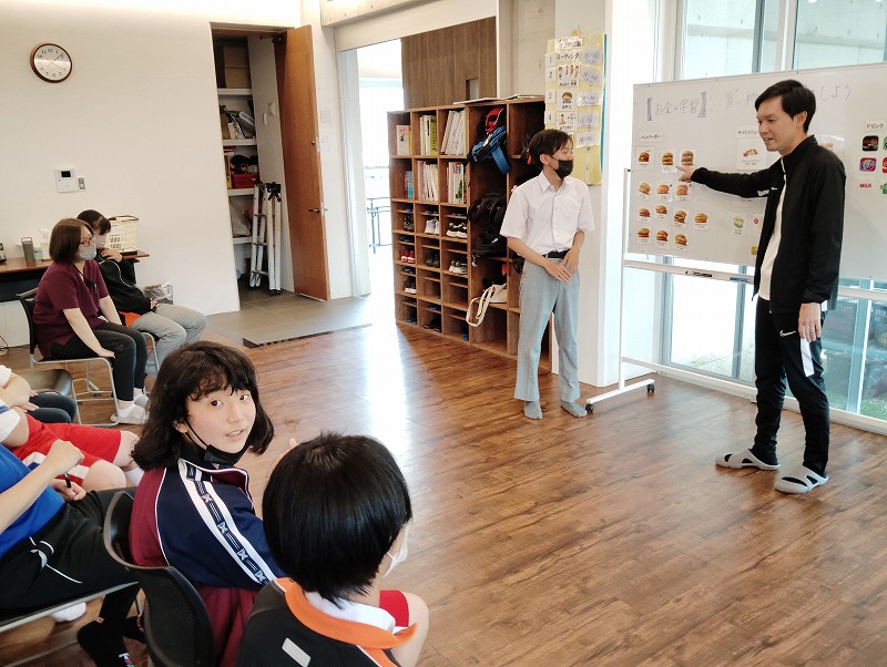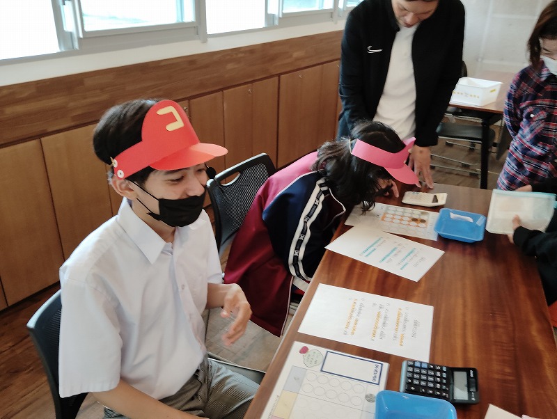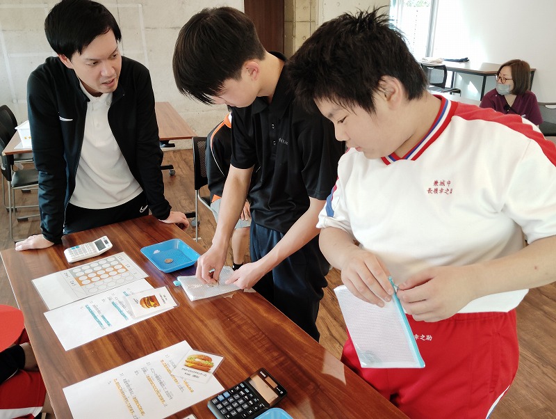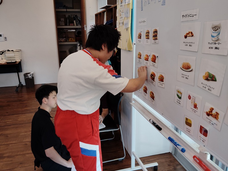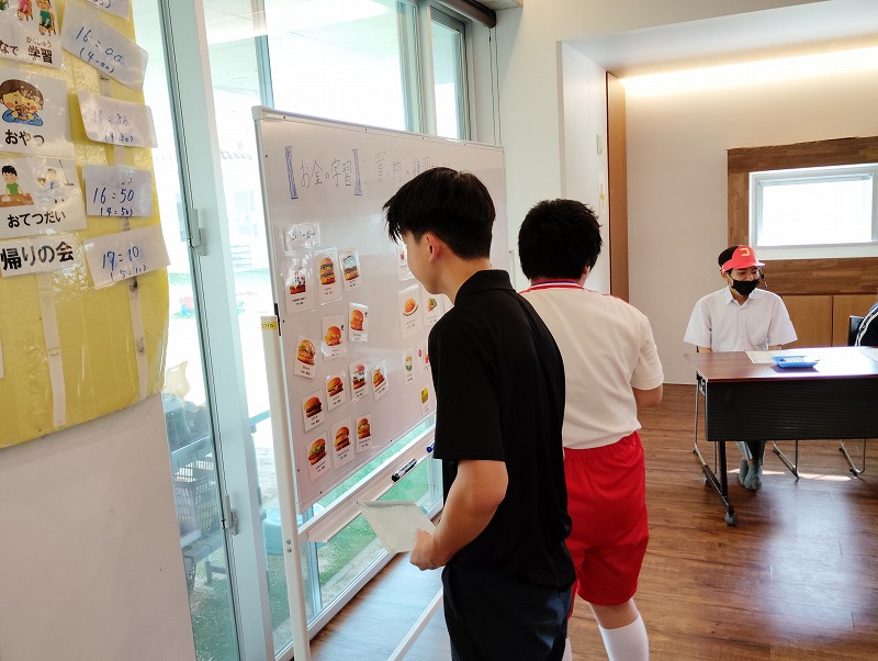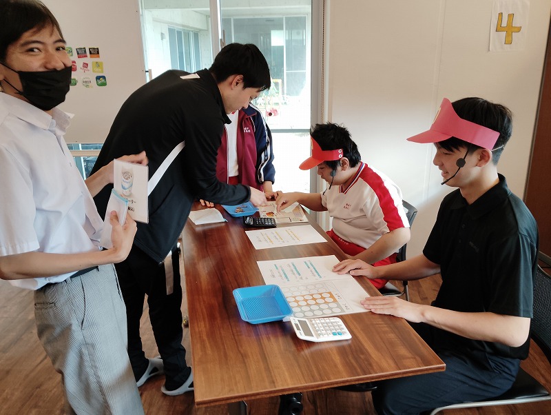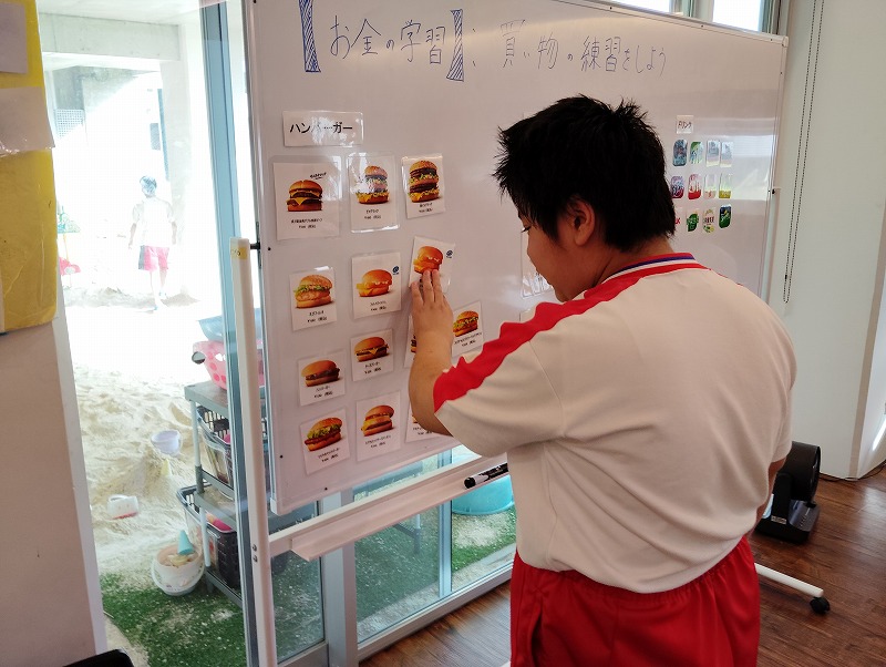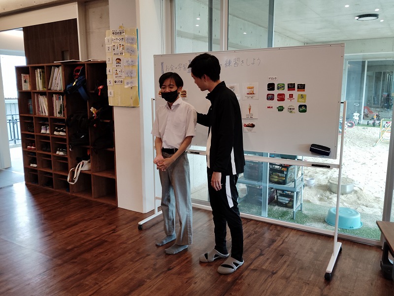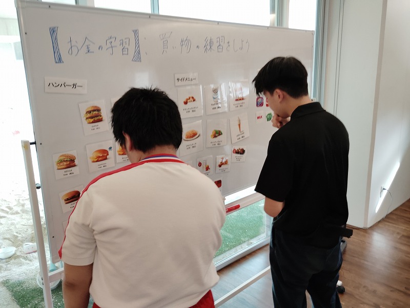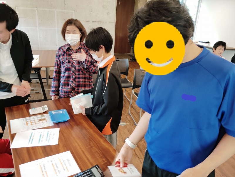 今回の学習は商品の購入する練習と、職業体験を兼ねた接客の練習もしました。普段お買い物になれている子とそうでない子がいました。接客練習は台本を見ながら練習しました。和気あいあいぁと楽しみながらの学習でした。