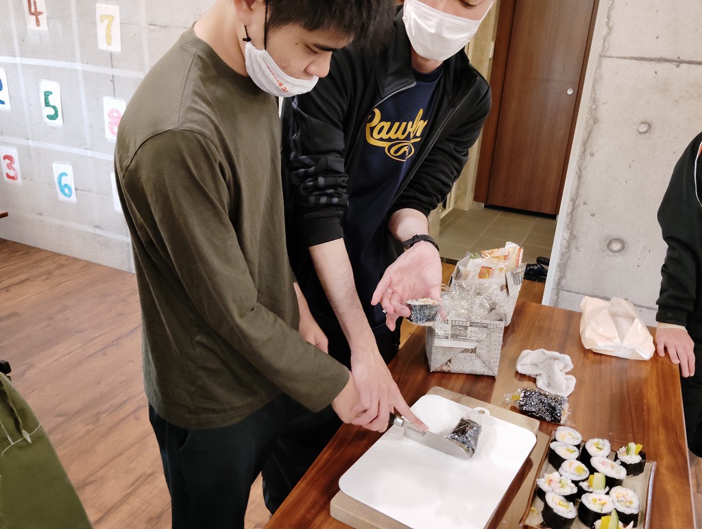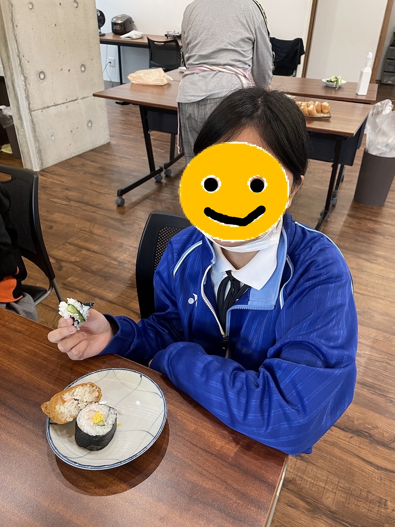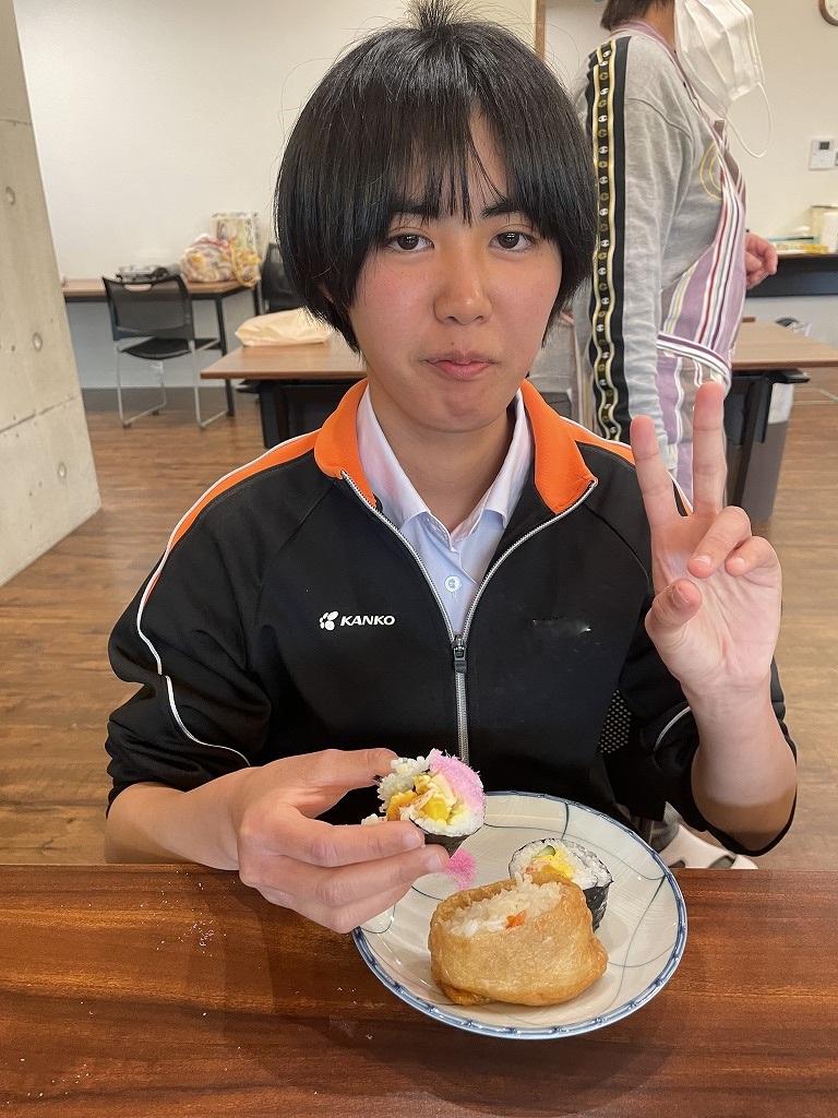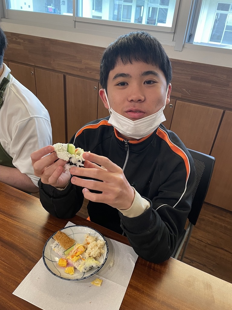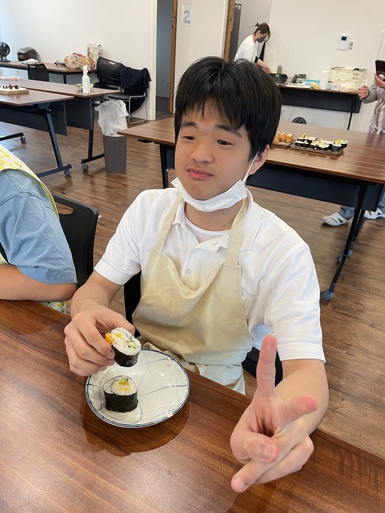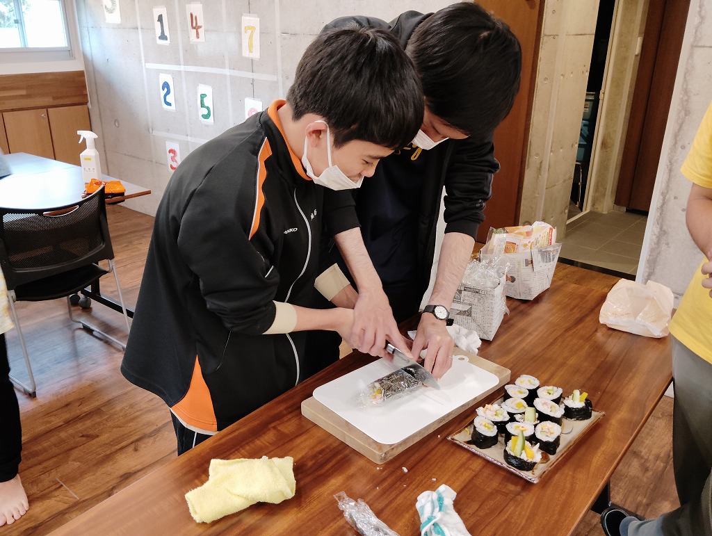 きゅうりやカニカマや卵焼きといった材料の細く切りだして準備をして、そこから巻いて一つのお寿司にしていく工程は大変でしたが、中々体験することない良い調理機会となりました。みんな美味しくいただきました!