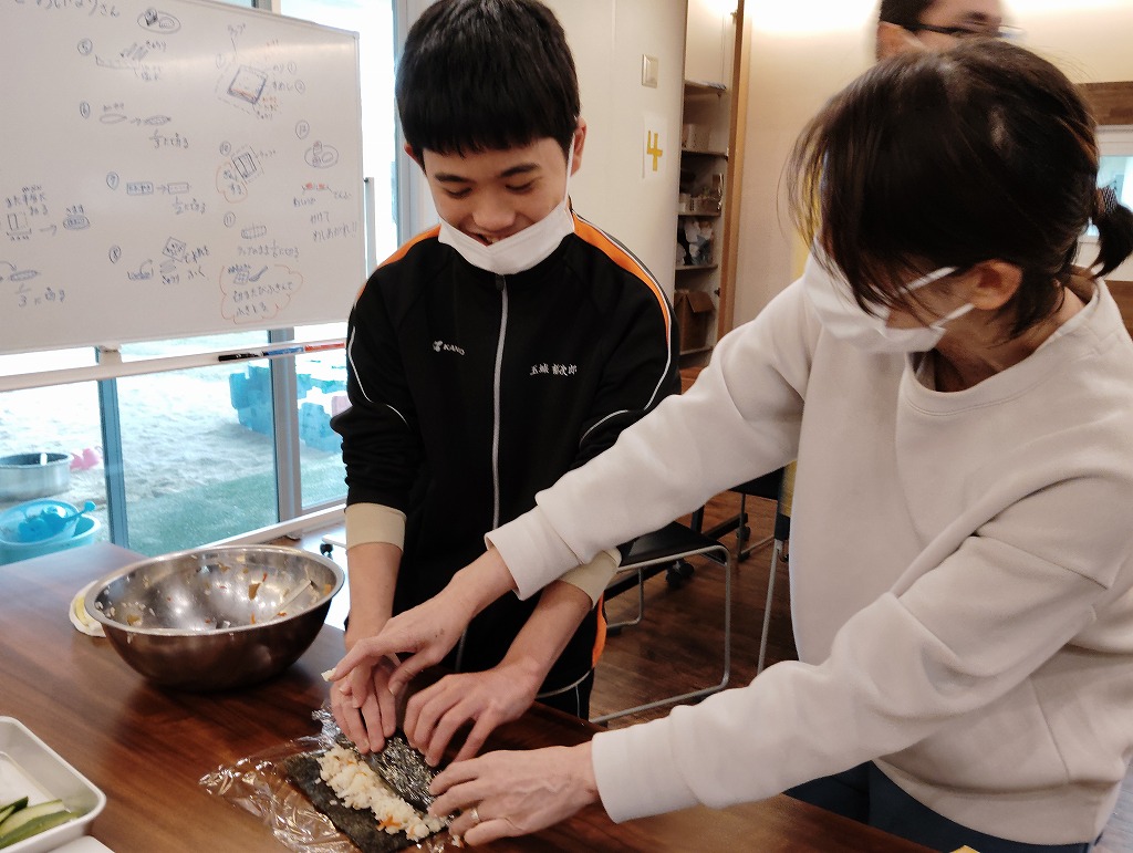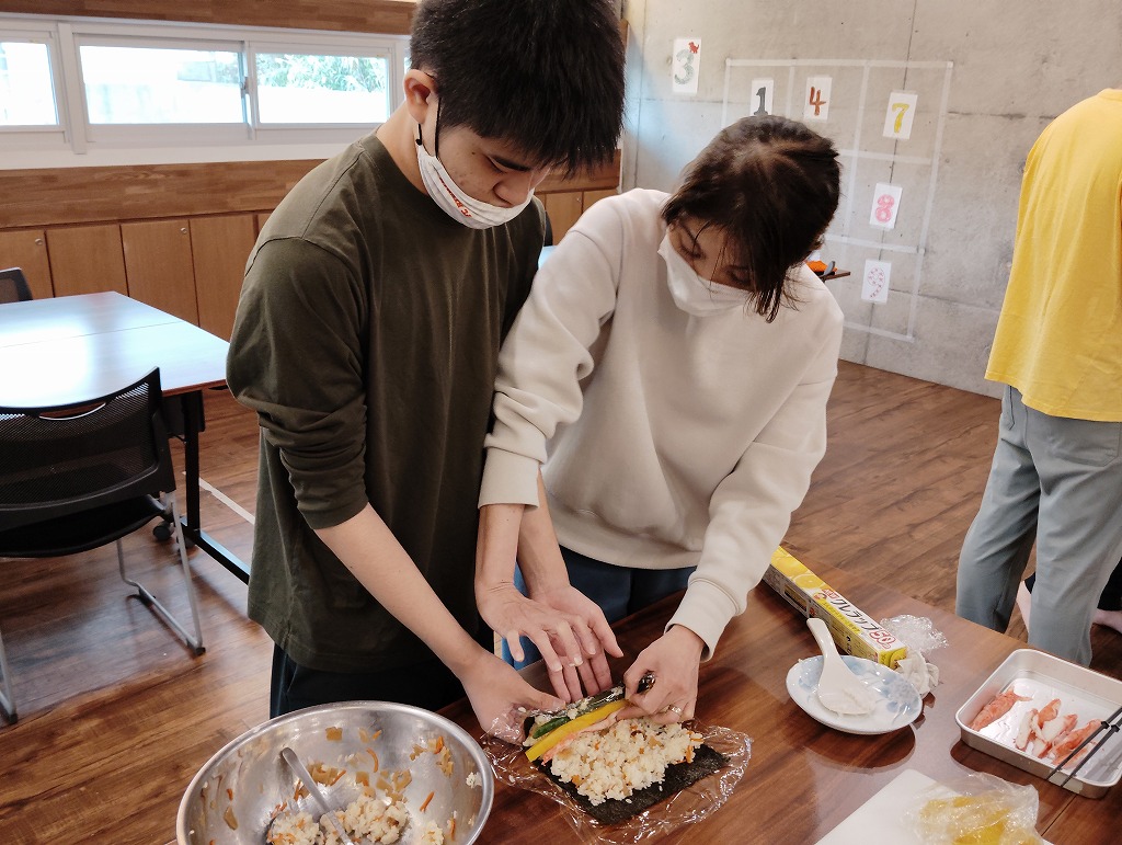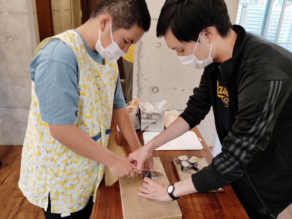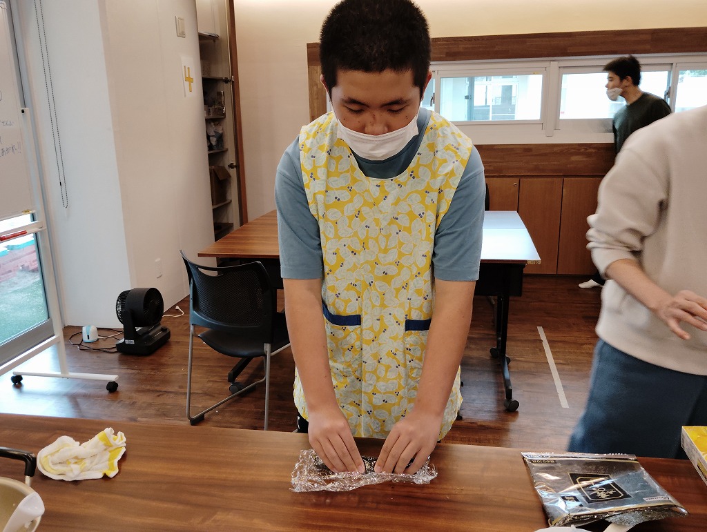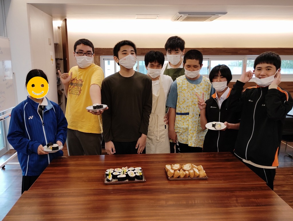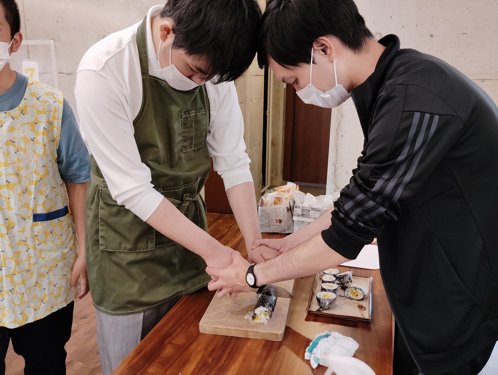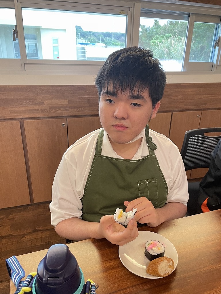 きゅうりやカニカマや卵焼きといった材料の細く切りだして準備をして、そこから巻いて一つのお寿司にしていく工程は大変でしたが、中々体験することない良い調理機会となりました。みんな美味しくいただきました!