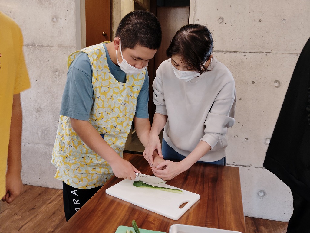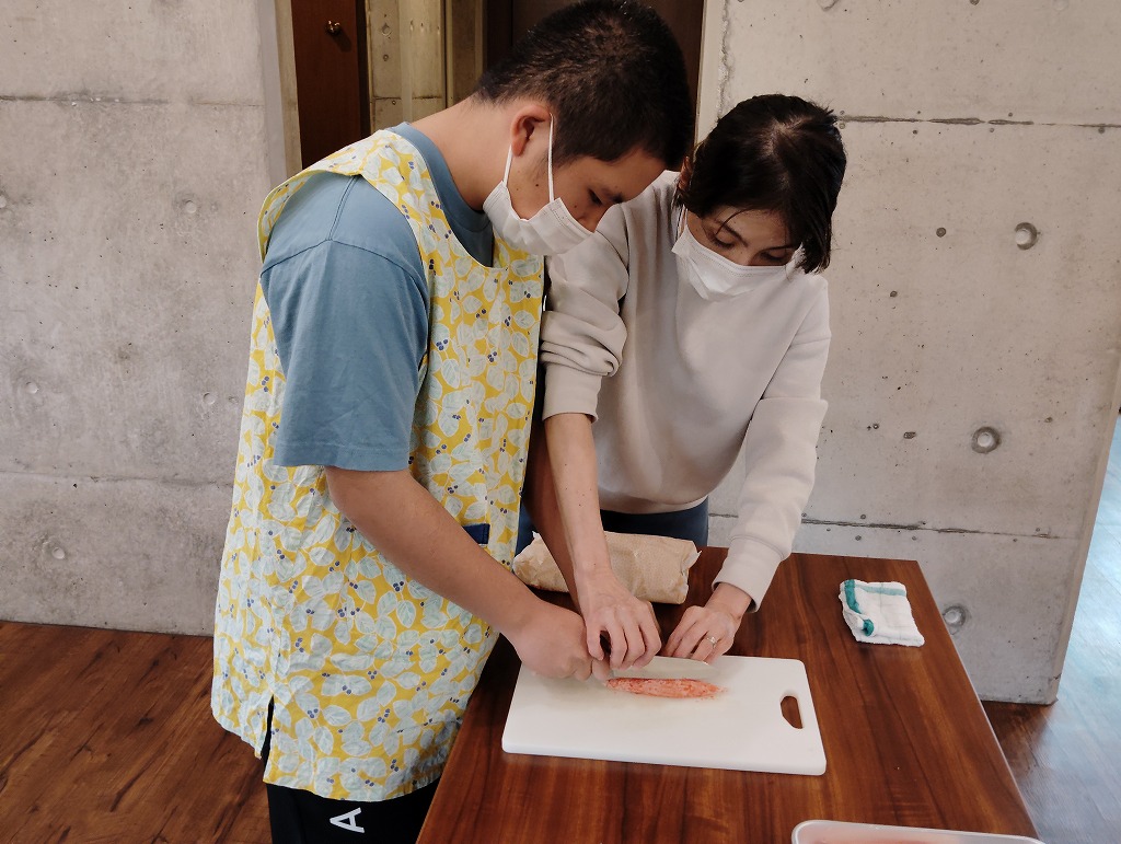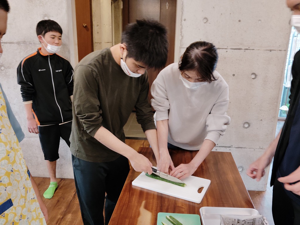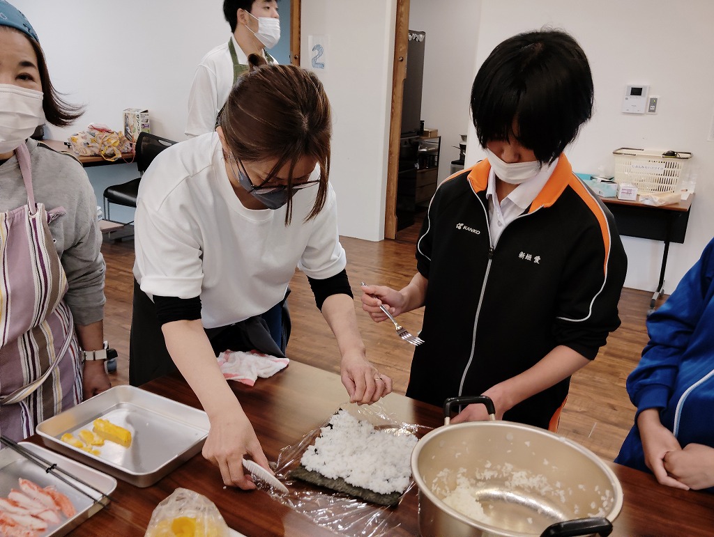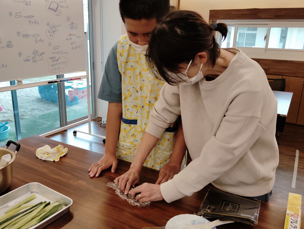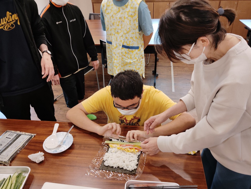 きゅうりやカニカマや卵焼きといった材料の細く切りだして準備をして、そこから巻いて一つのお寿司にしていく工程は大変でしたが、中々体験することない良い調理機会となりました。みんな美味しくいただきました!