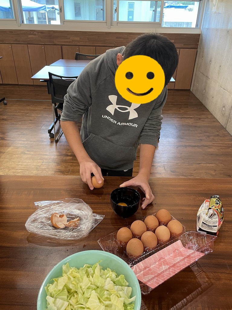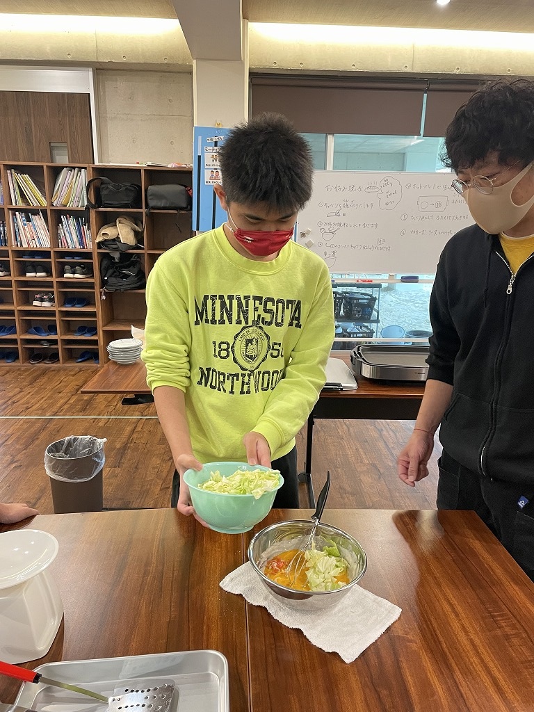 計量カップで分量を量り、卵を割り入れ、千切りにしたキャベツを加えてお好み焼きのタネづくりからはじめました。