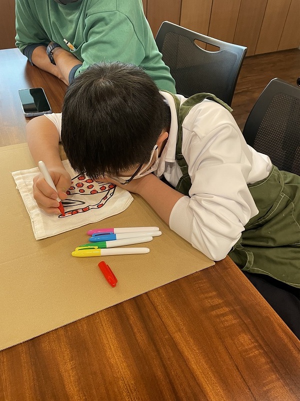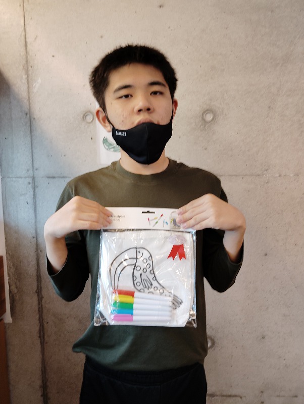 小さなカバンに色塗りをするプレゼントです。みんな個性的な色塗りができました。
