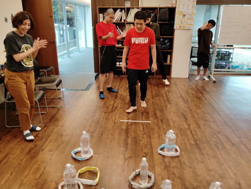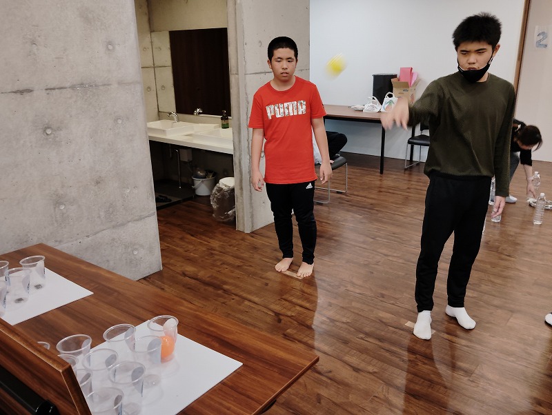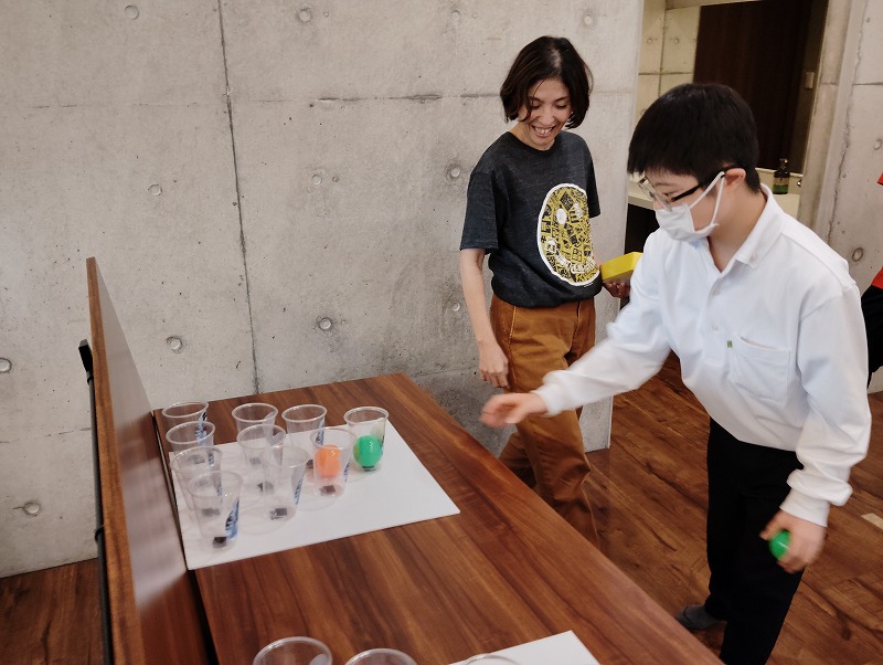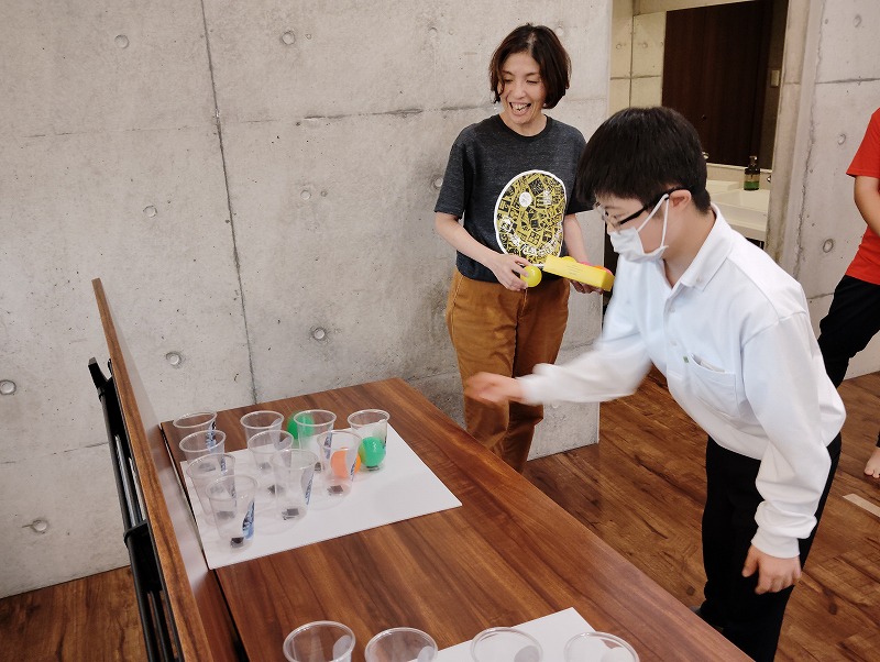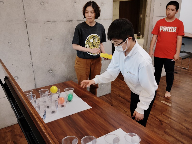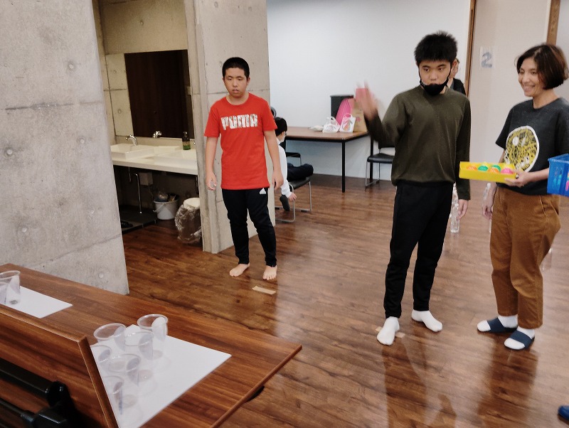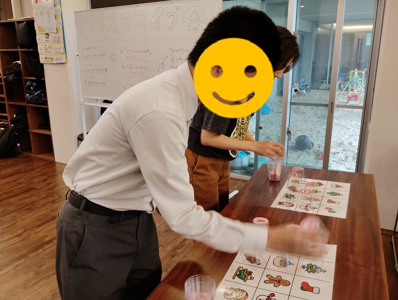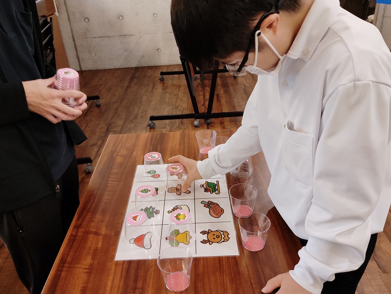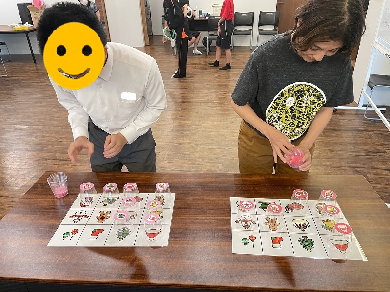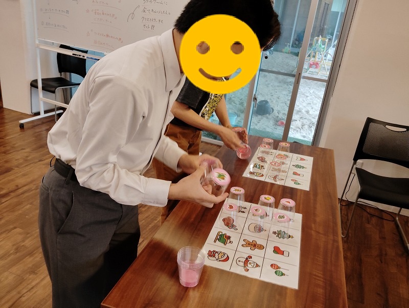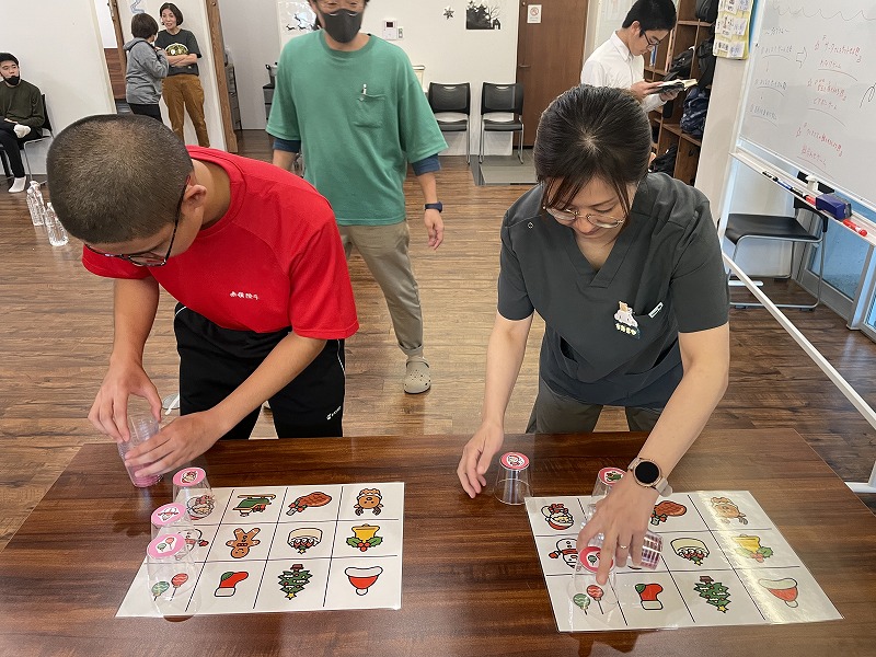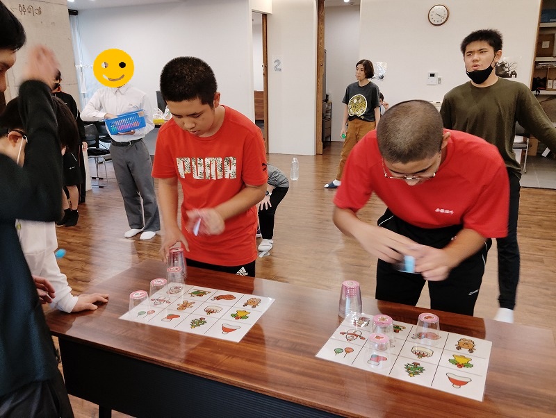 3つめはイラスト絵合わせゲームです。イラストの描かれた紙と同じ柄のカップを合わせるゲームです。対戦形式のゲームですので、みんな勝とうと頑張ってました。