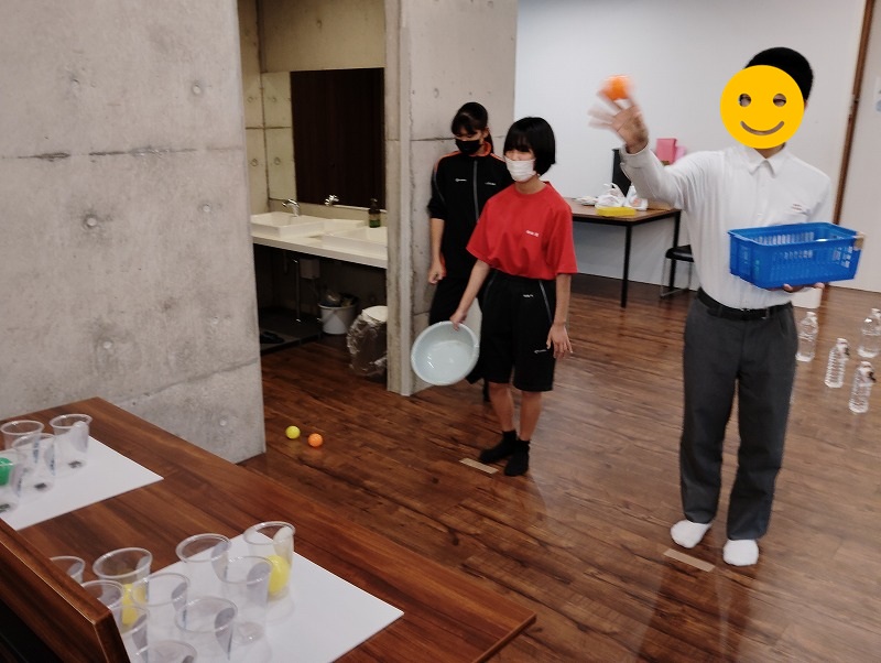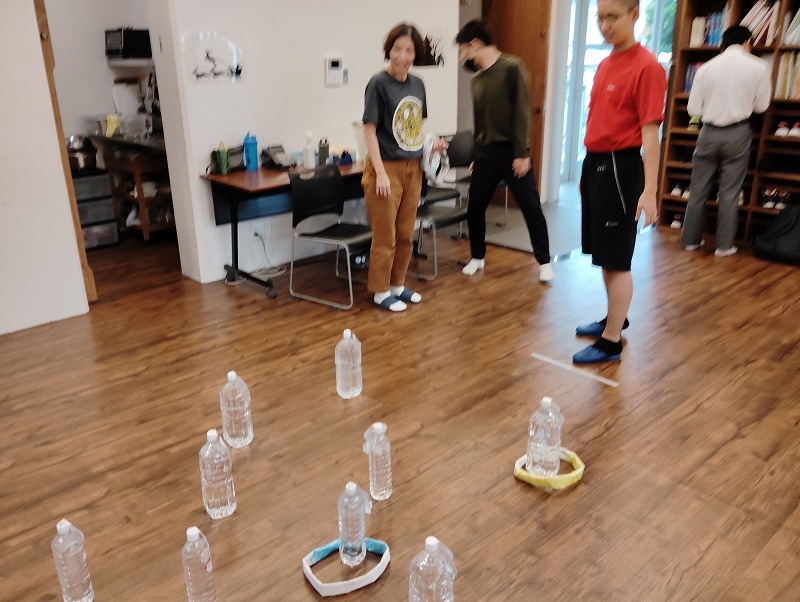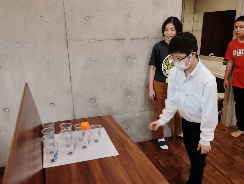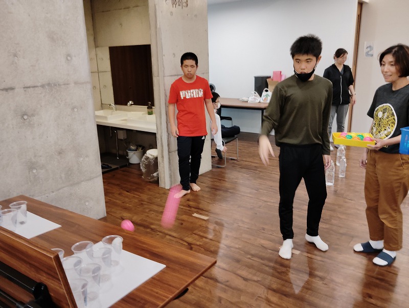 ビアポンという並んだカップにボールを入れるゲームです。これもなかなか難しくてみんな一球ごとに一喜一憂してました。