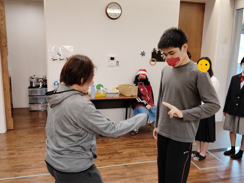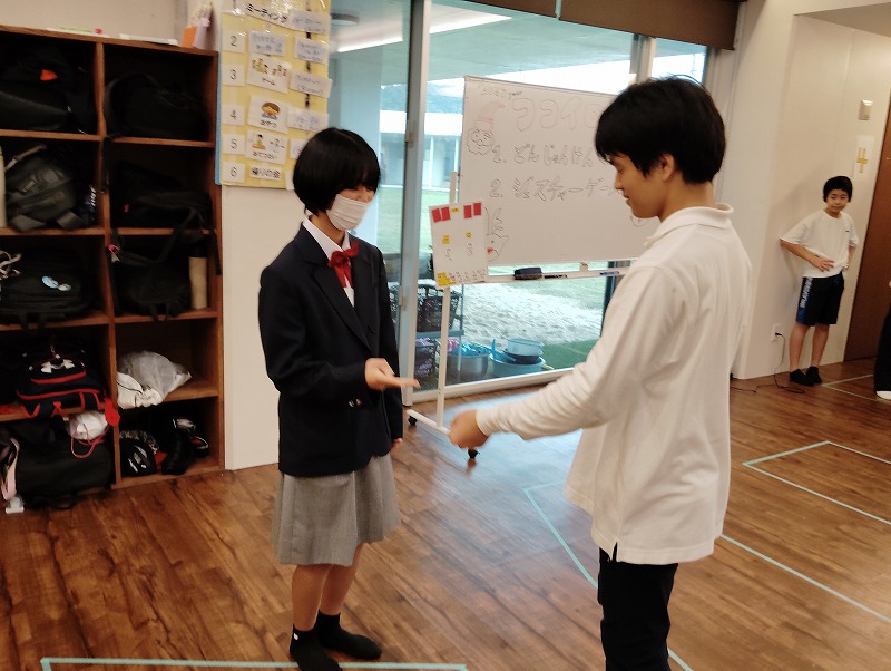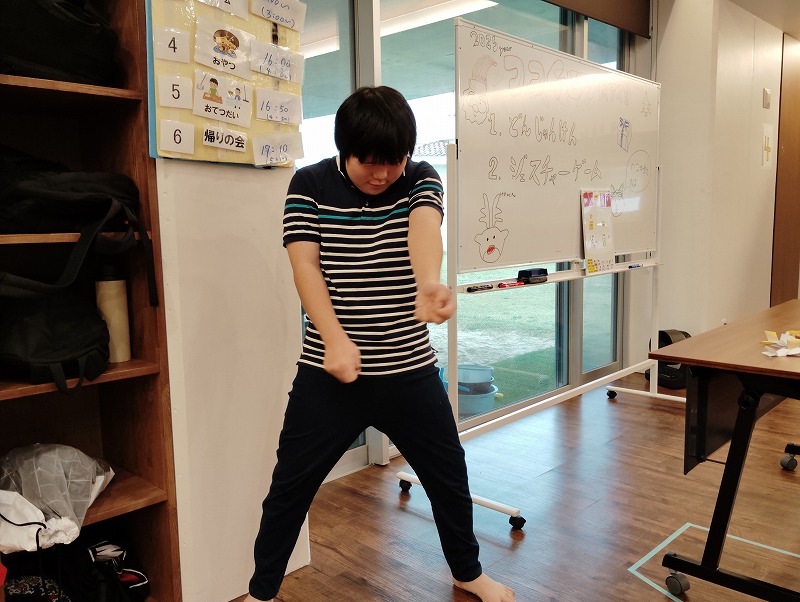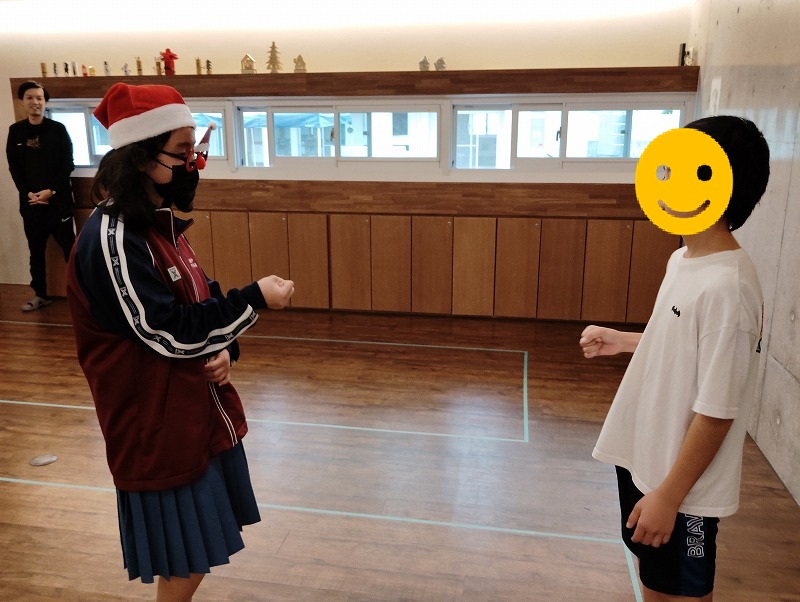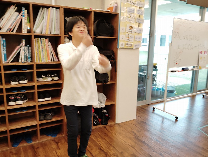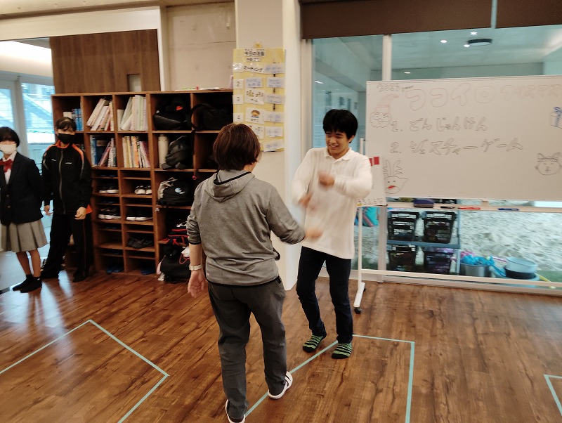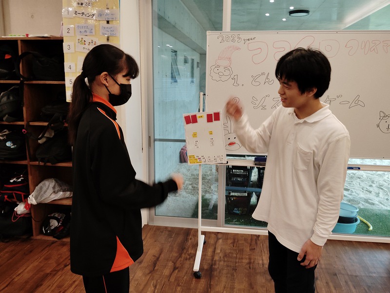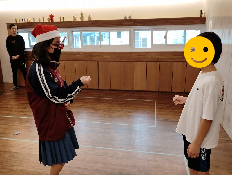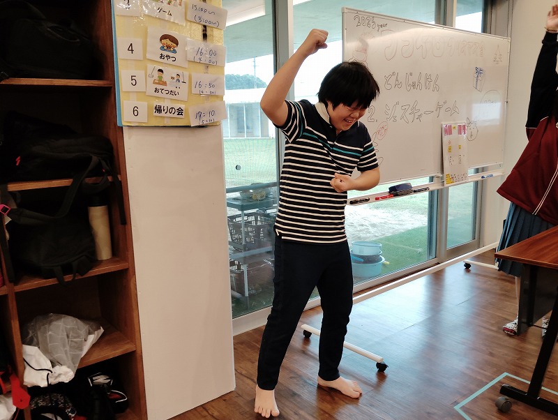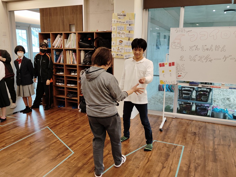 二つ目はジェスチャーゲームです。「スポーツ」「職業」「動物」の3つのジャンルのなかから選んでもらってジェスチャーしてもらいました。みんな上手ですぐに当てることができました。ちなみに女子は恥ずかしがってましたが、男子はノリノリでした。