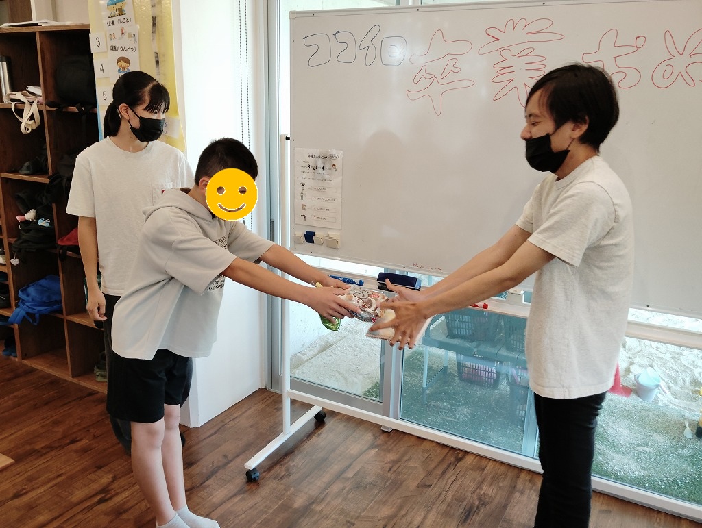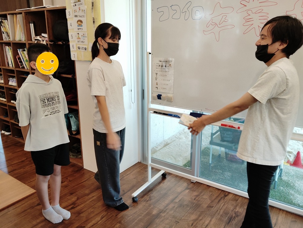 卒業式といっても、大々的なものではなく、次年度より高等特別支援学校を終えて次のステップへ移る児童がいたので、卒業後の意気込みを発表したりみんなで惜別の品を渡したりする会となりました(^^♪