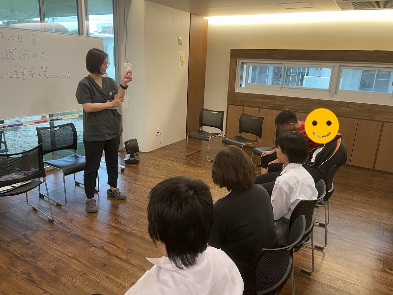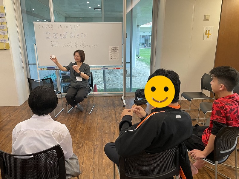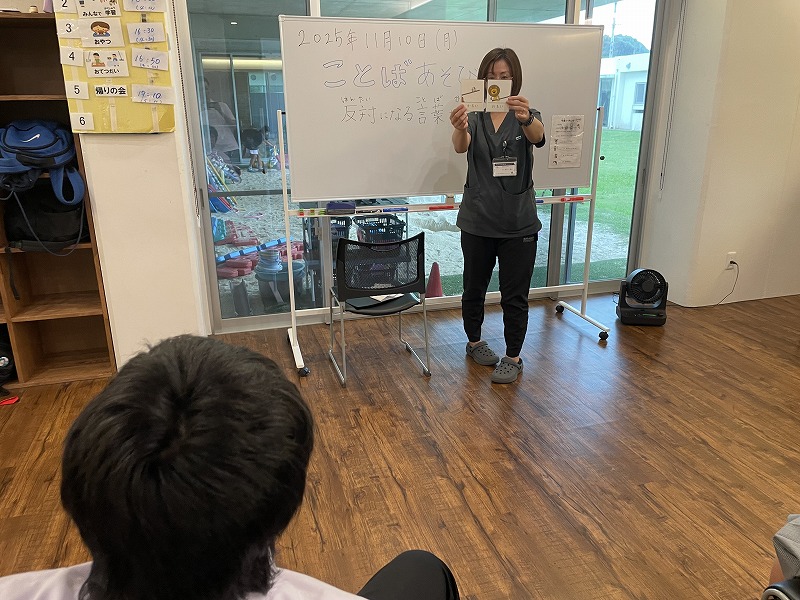 11月10日のココイロでは、「コトバ遊び」の活動で反対言葉を考えたり、質問形式に答えるゲームを行いました。
