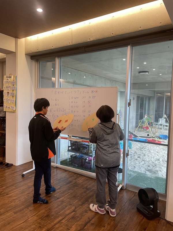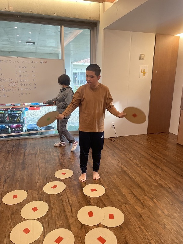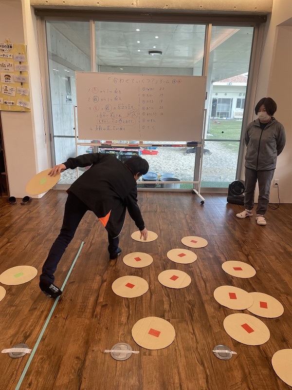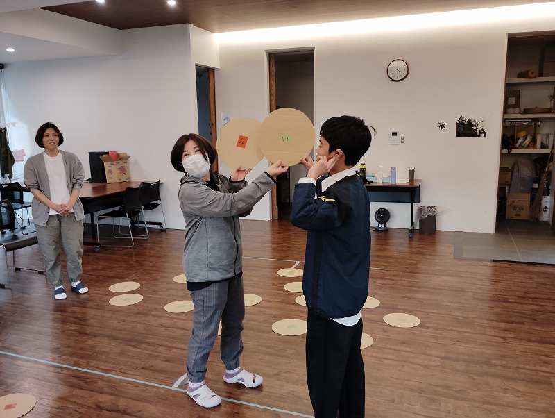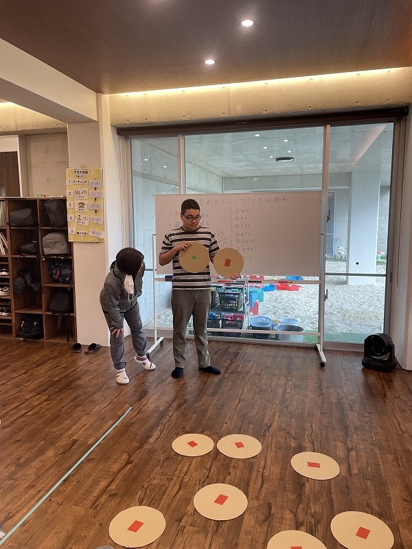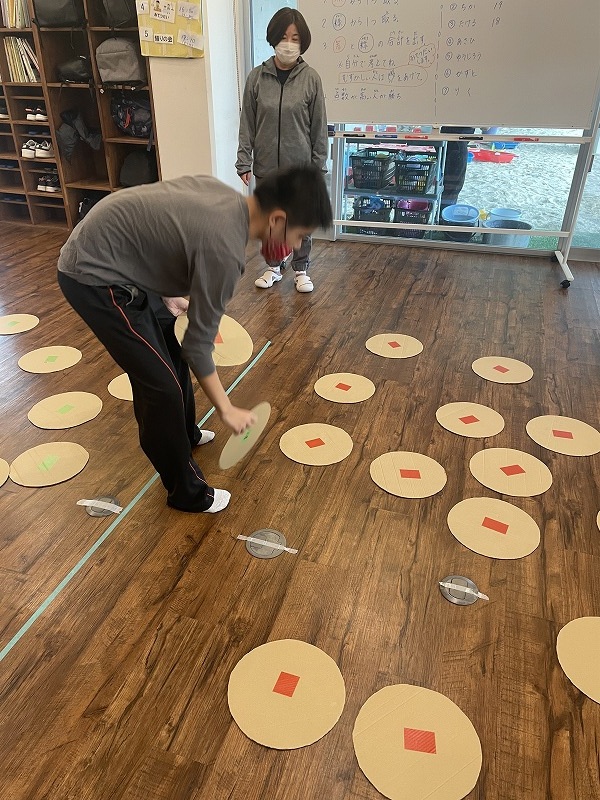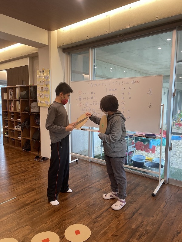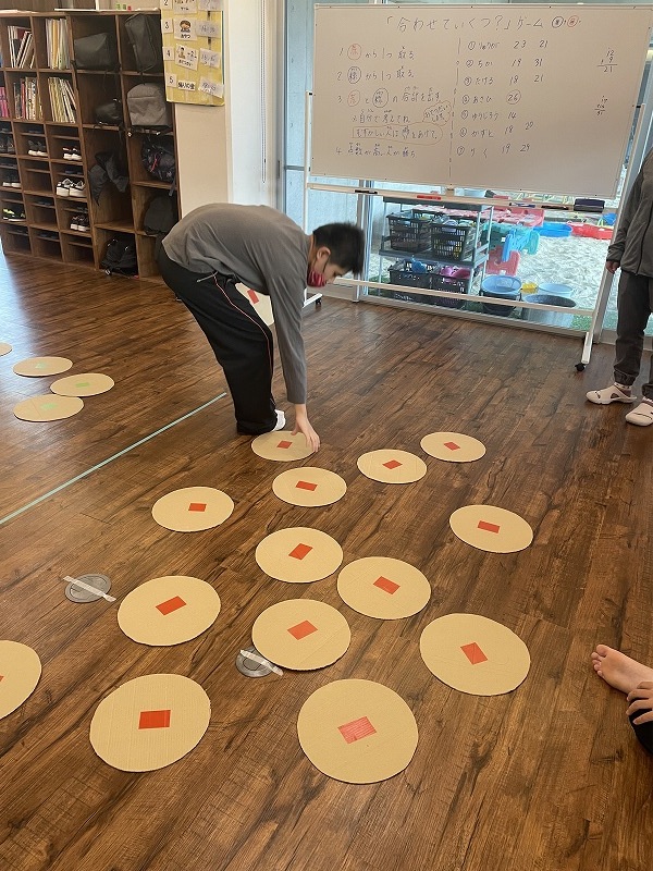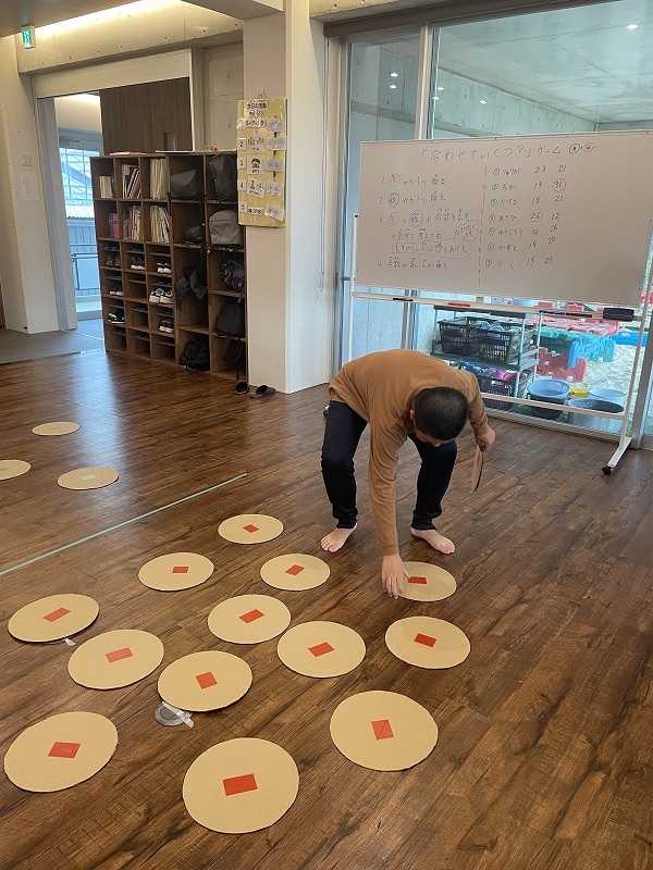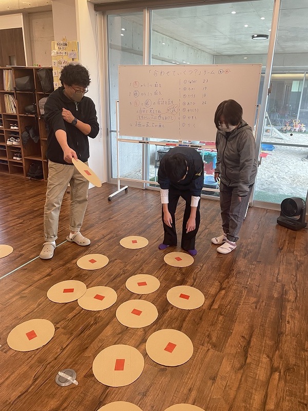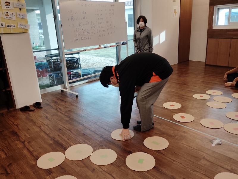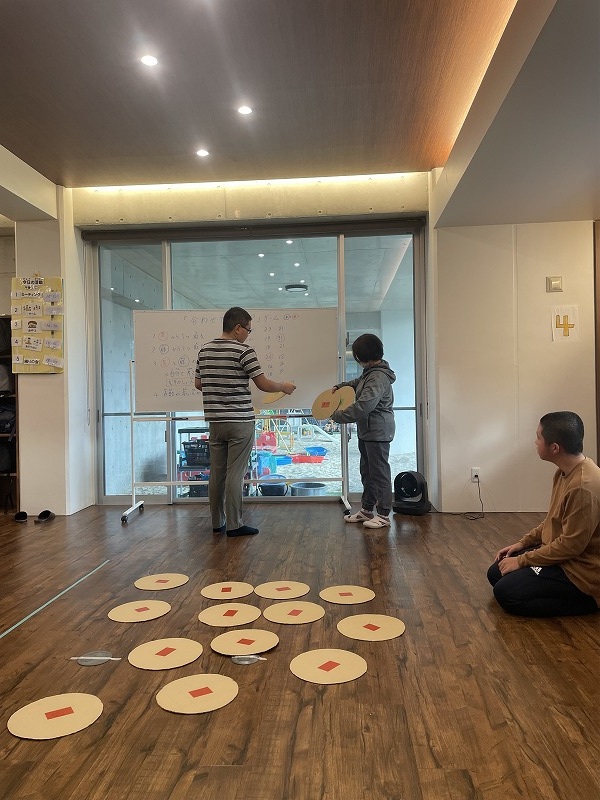 このゲームは床に置いた大きな丸いカードの裏に数字が書いていて、それを2枚引いてでた数の合計を出すゲームです。どの数字を引くのかは裏返しているので、わかりません。計算は暗算でできる子もいればサポートすることで答えを出せす子もいました。2回戦以降は足す枚数を3枚、4枚と増やしていきました。計算が大変そうでしたが、みんな頑張って考えてくれました。