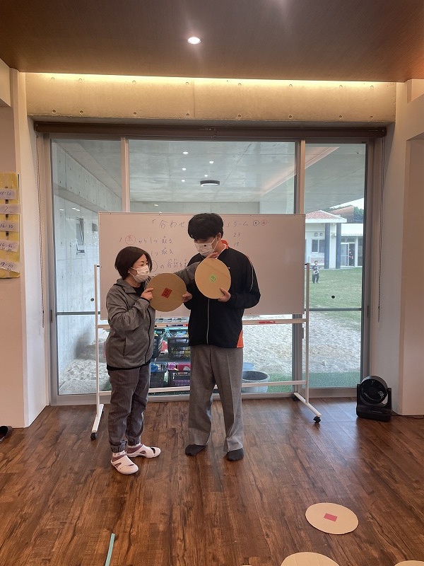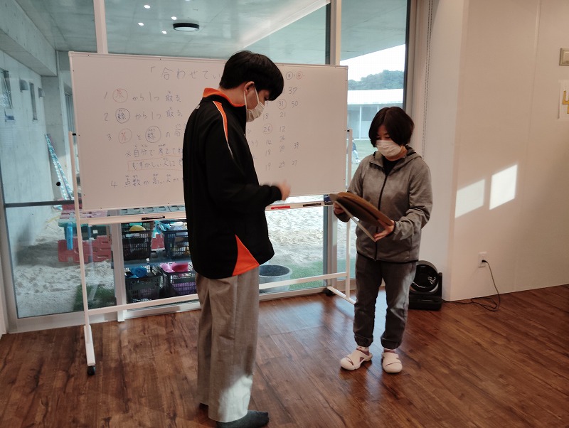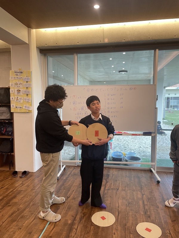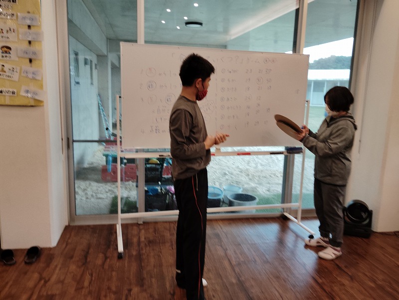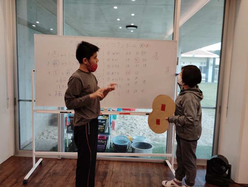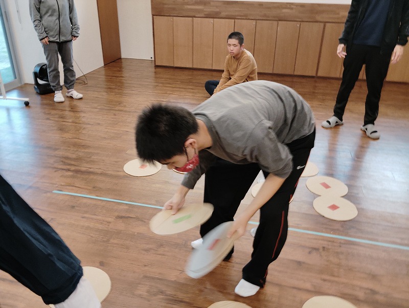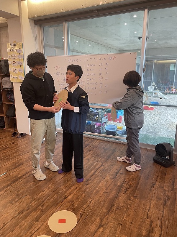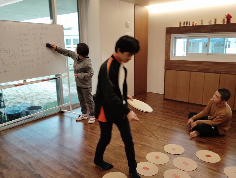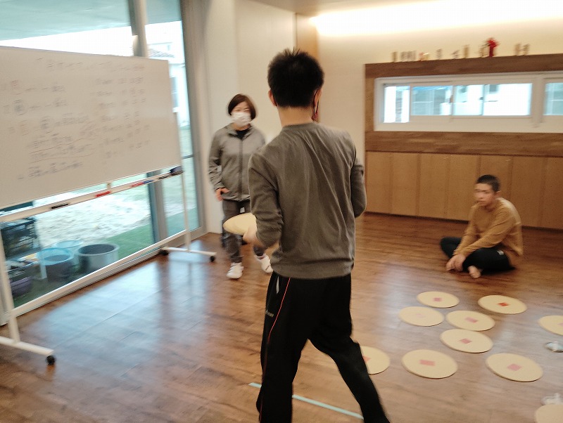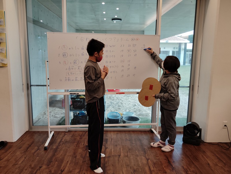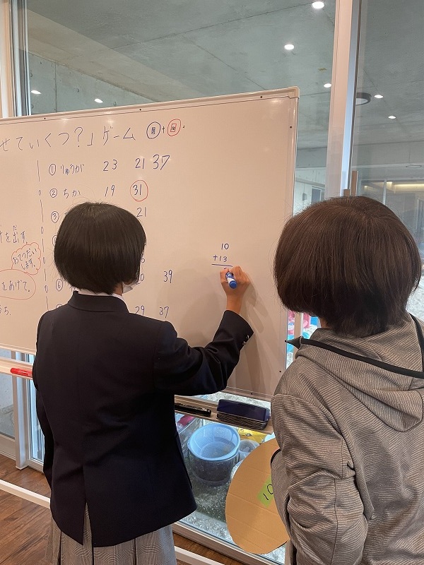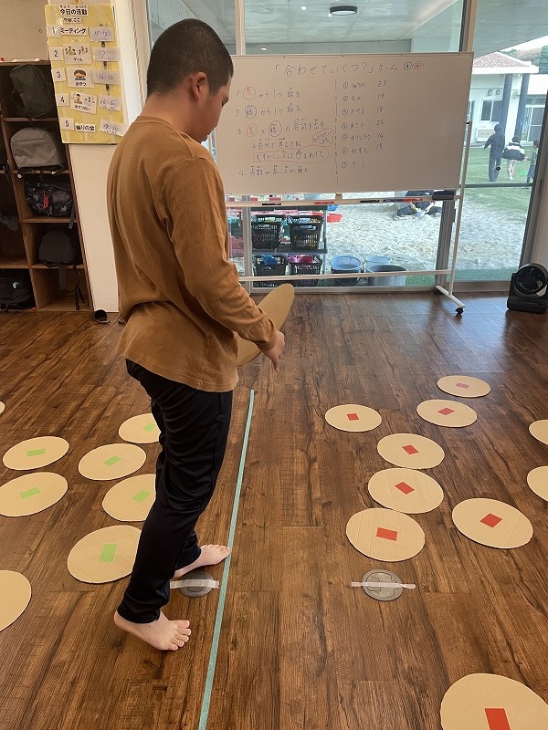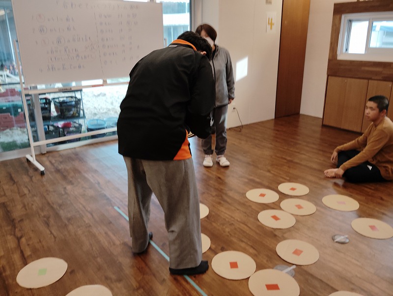 このゲームは床に置いた大きな丸いカードの裏に数字が書いていて、それを2枚引いてでた数の合計を出すゲームです。どの数字を引くのかは裏返しているので、わかりません。計算は暗算でできる子もいればサポートすることで答えを出せす子もいました。2回戦以降は足す枚数を3枚、4枚と増やしていきました。計算が大変そうでしたが、みんな頑張って考えてくれました。