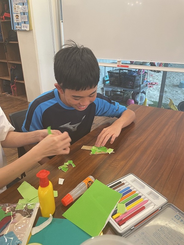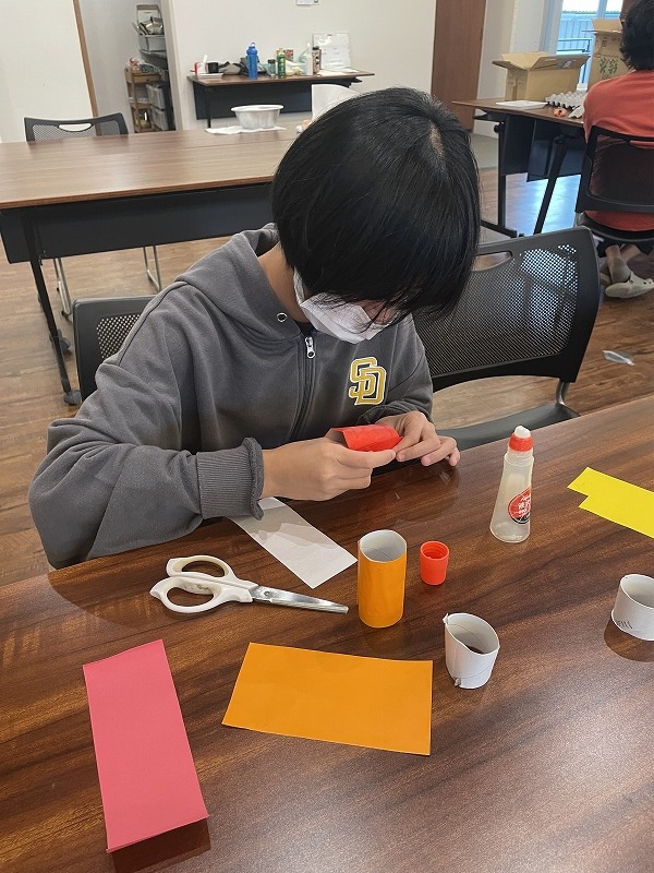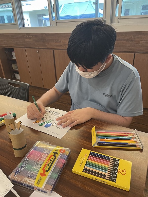 午後の前半の活動ではクリスマス製作を行い、サンタさんやクリスマスツリーの置型小物や色塗りをして作品作りをしました。出来上がった作品はクリスマス期間はココイロ内でディスプレイしておき、期間終了後に各児童のご家庭へ持ち帰ってもらいます。