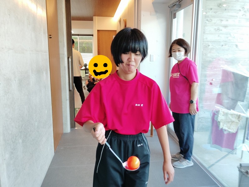 お次は、お玉にボールを乗せ運びます。いかにバランスよく早く運べるかが大切です。