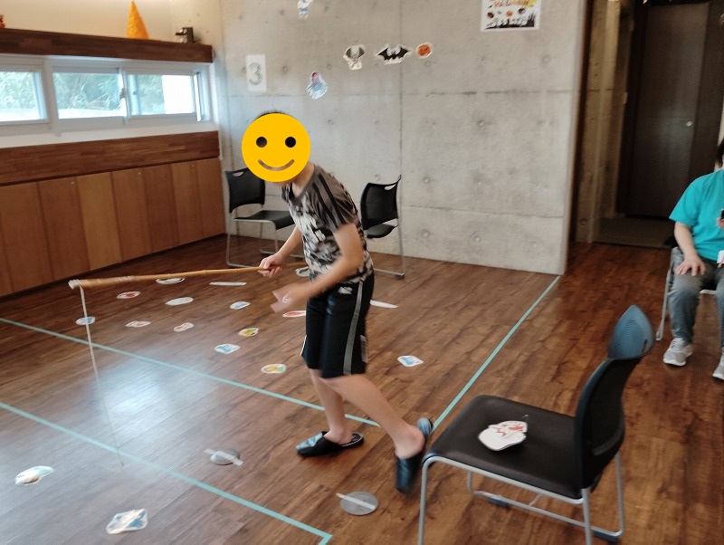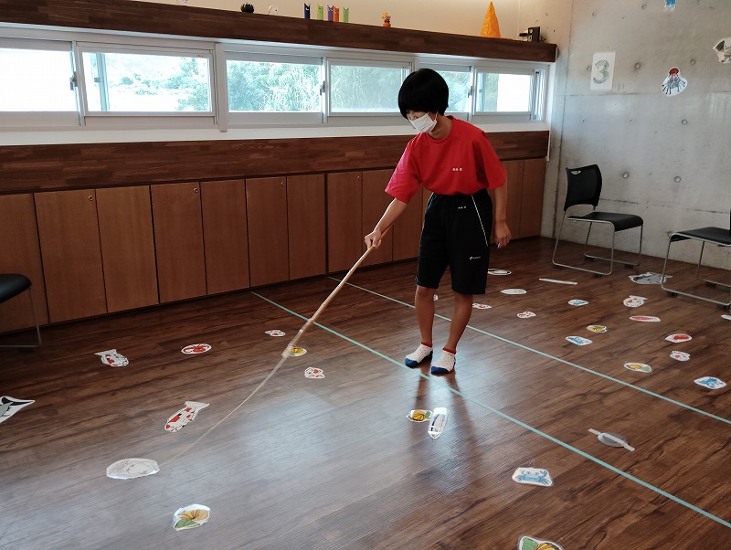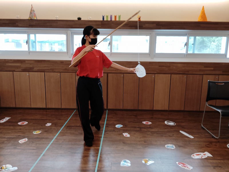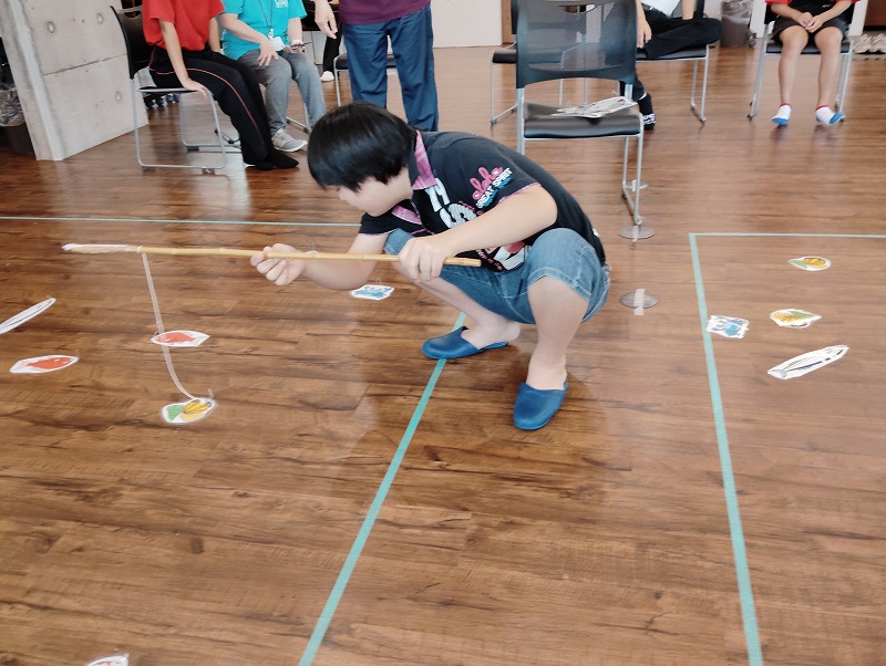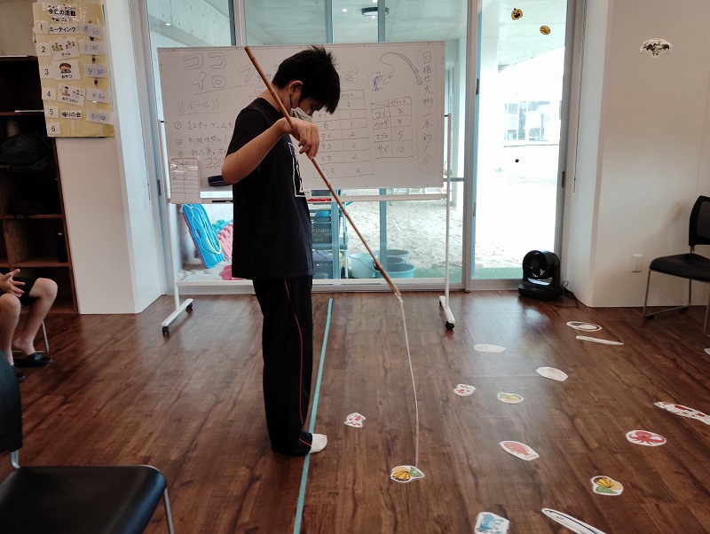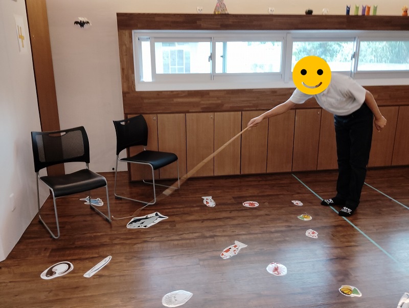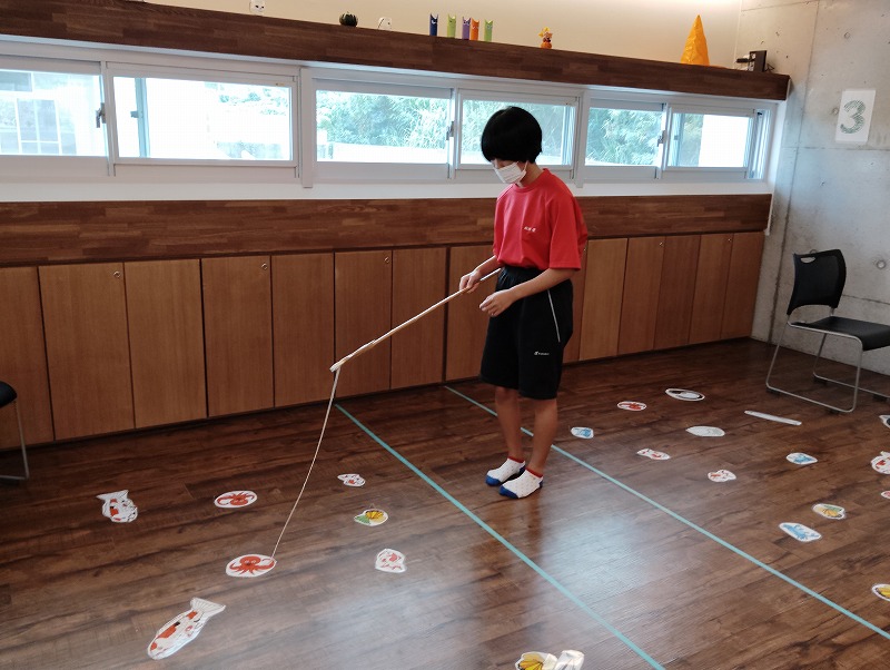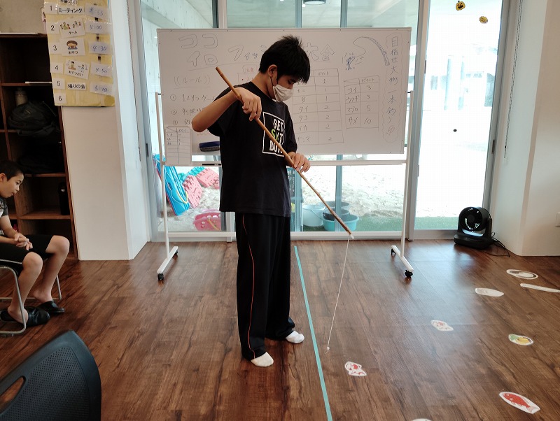 色々なお魚や貝などのイラストにフックをつけたものを、釣り竿で引っ掛けるようにして釣ってもらいました。時間をひとり1分ほどにして時間内でどれだけ釣れるのかを競ってもらいました。大物(サメ)狙い一択の子もいれば小物(貝など)をたくさん釣っている子もいました。性格がでてましたね~。