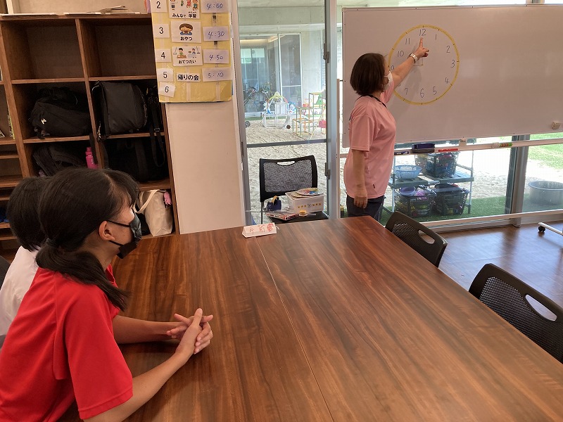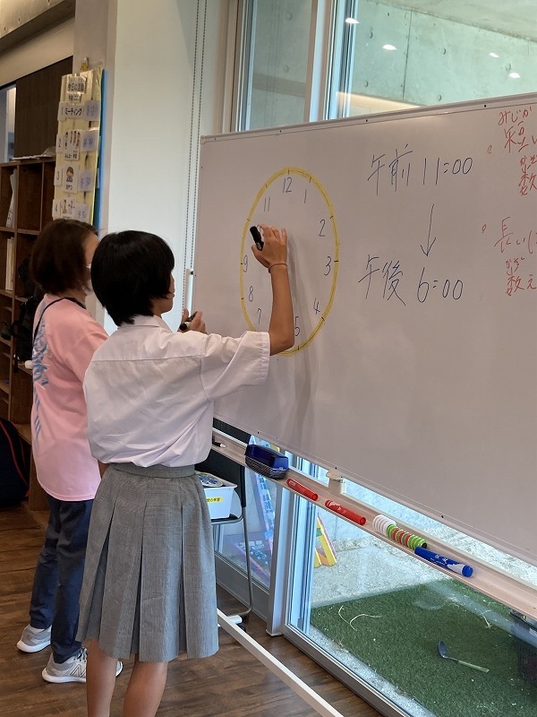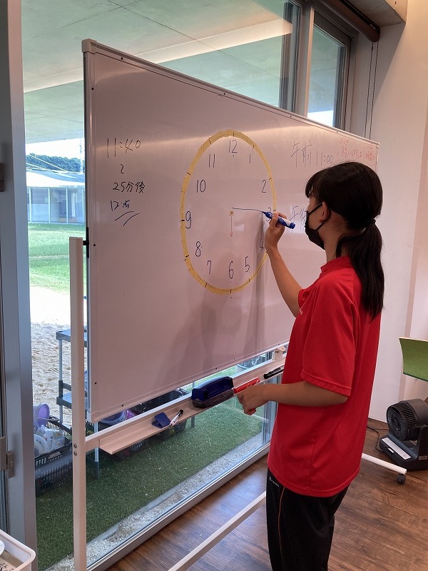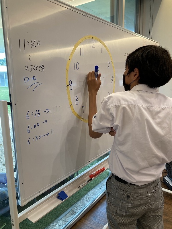 時計の針をホワイトボードに書き込みながら時刻の勉強を進めていきました。