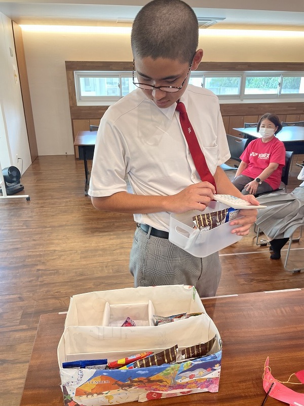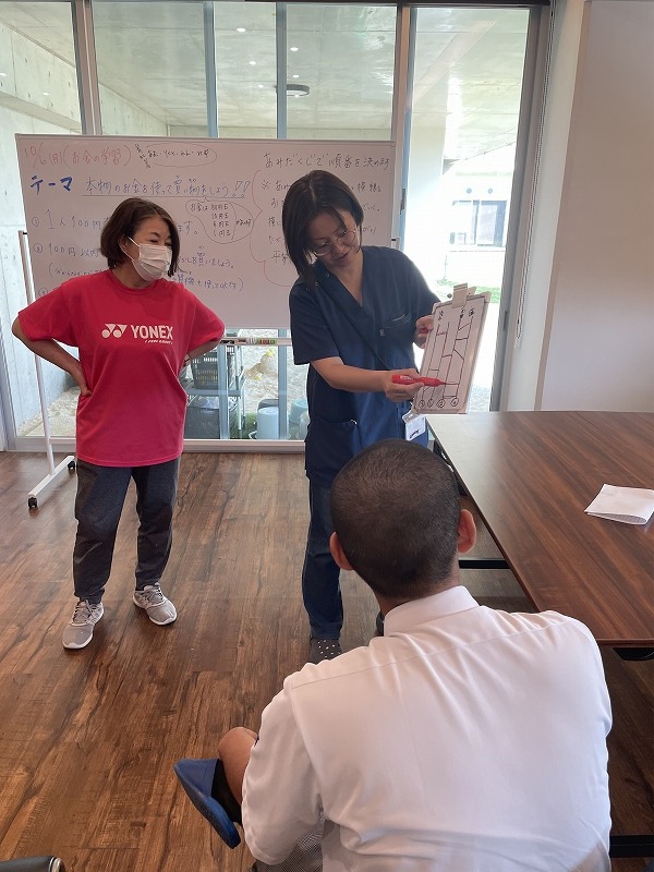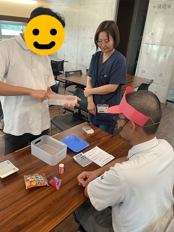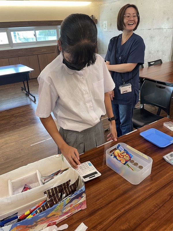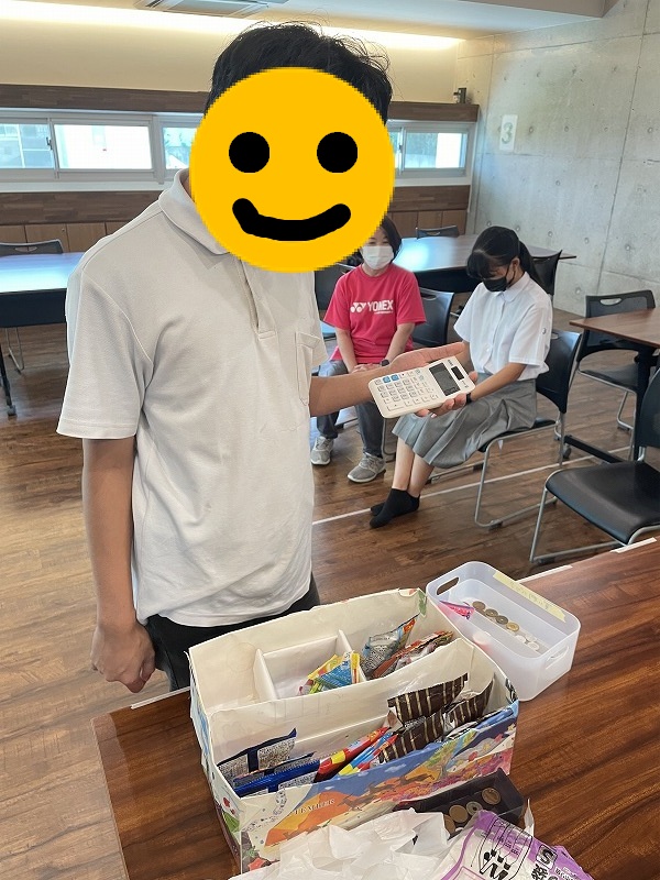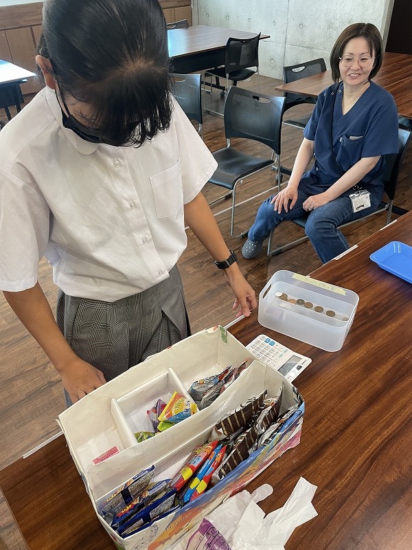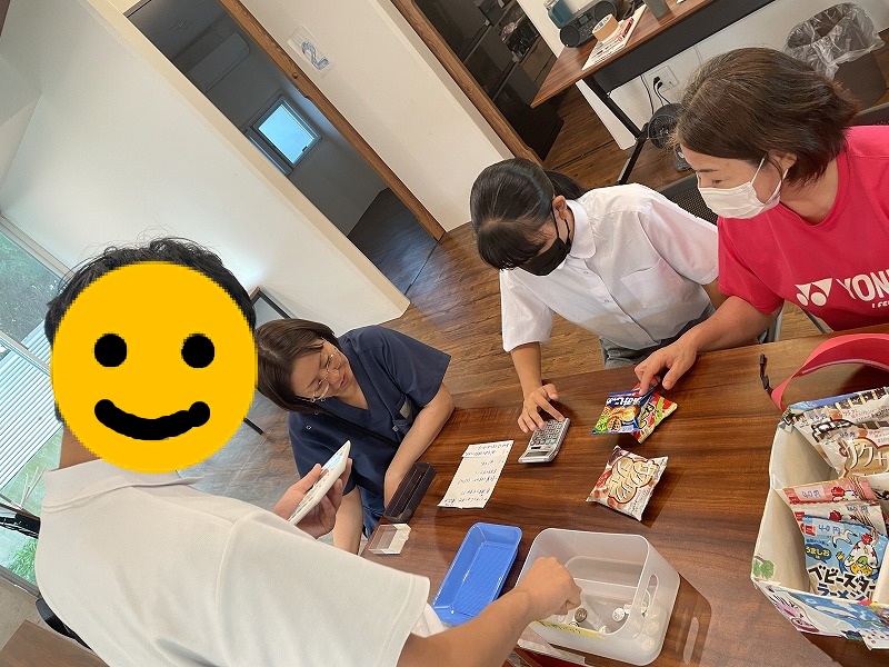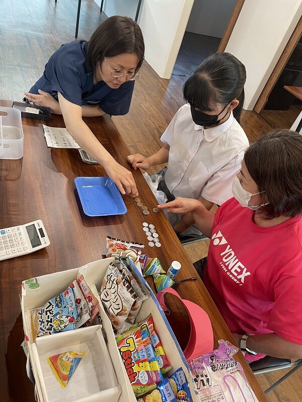 今回の買物学習では、本物のお菓子とお金を用意して、こどもたちの買物練習をしました。預けた硬貨のお金を使って値付けされたお菓子をなるべくおつりがでないような買物の練習と、職業訓練を兼ねてレジ係もこどもたちにお願いして計算してもらいました。