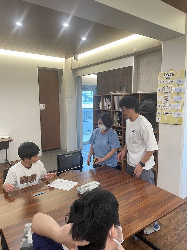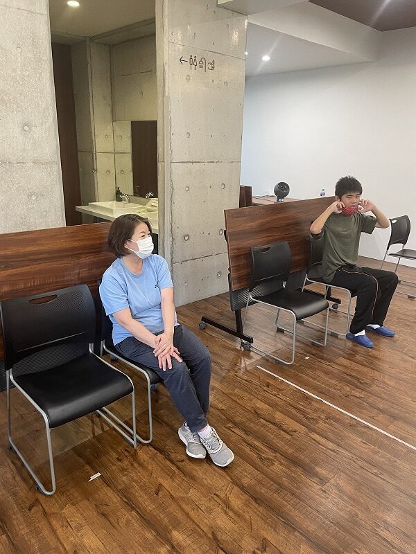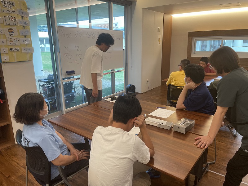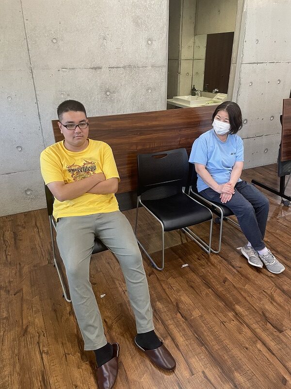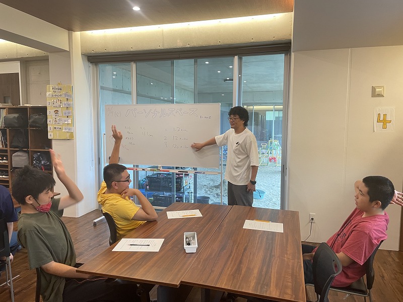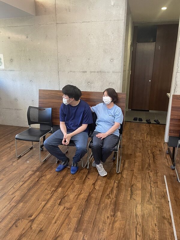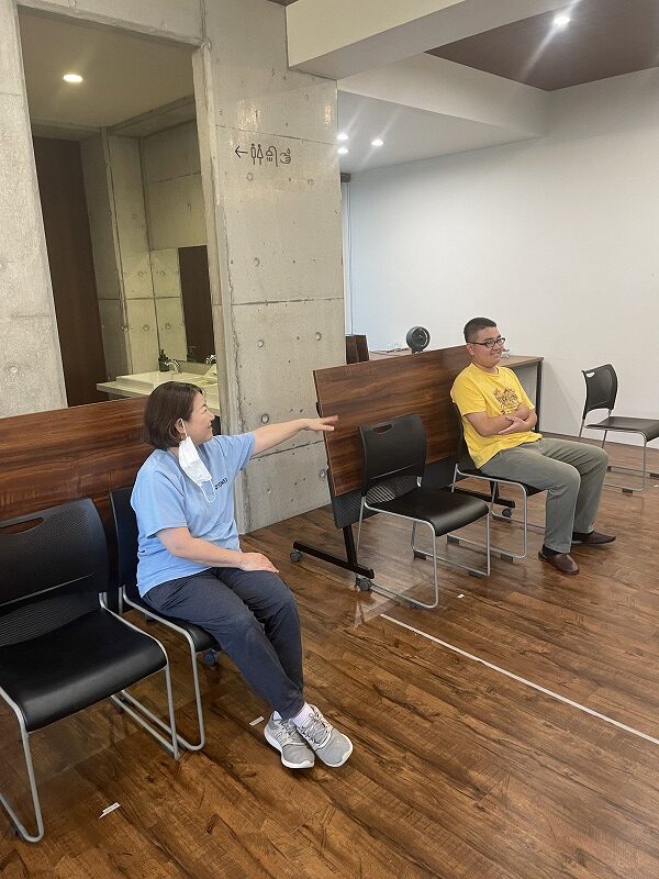 今回の学習では家族や親しい人、知ってる人、赤の他人に応じた距離の取り方を学習しました。職員を親戚や他人に見立てて実際に席についてもらって体験してもらいました。