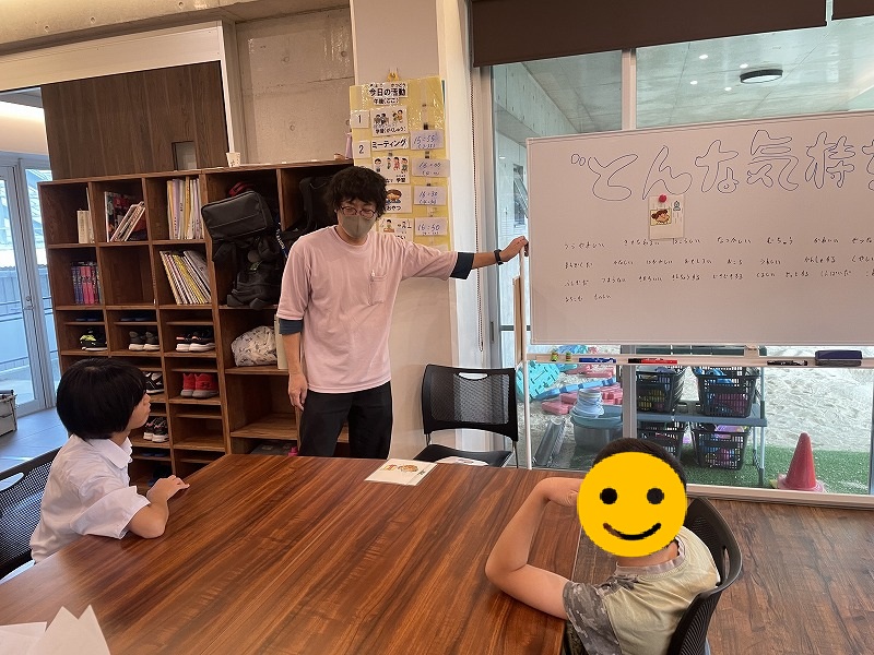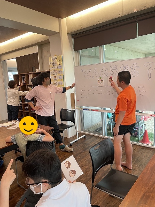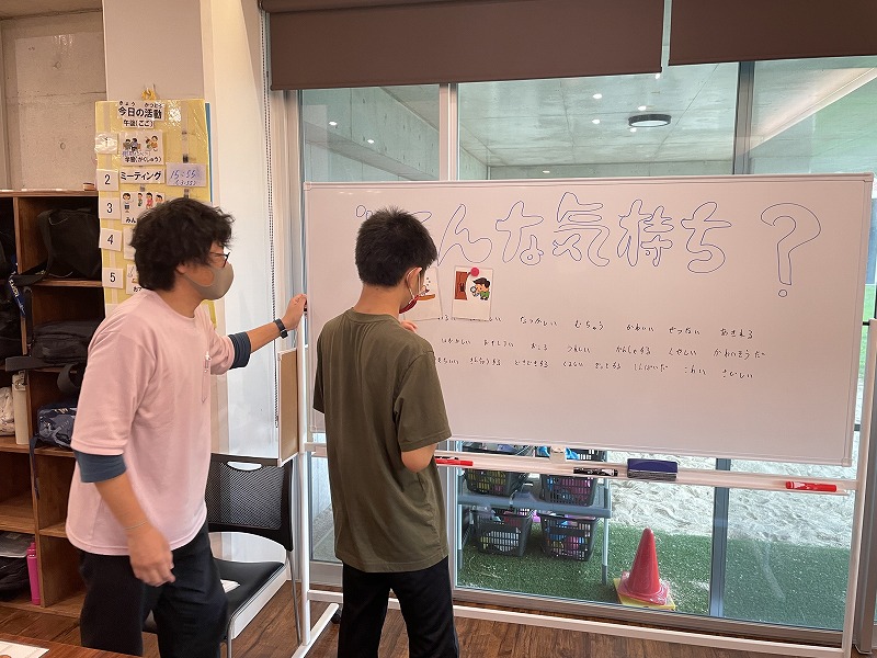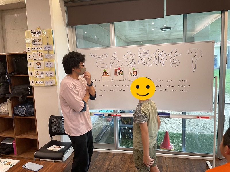事前にヒントとして、ホワイトボードには気持ちの種類を書き入れており、答えるのが難しい場合はそこから選んでもらいました。